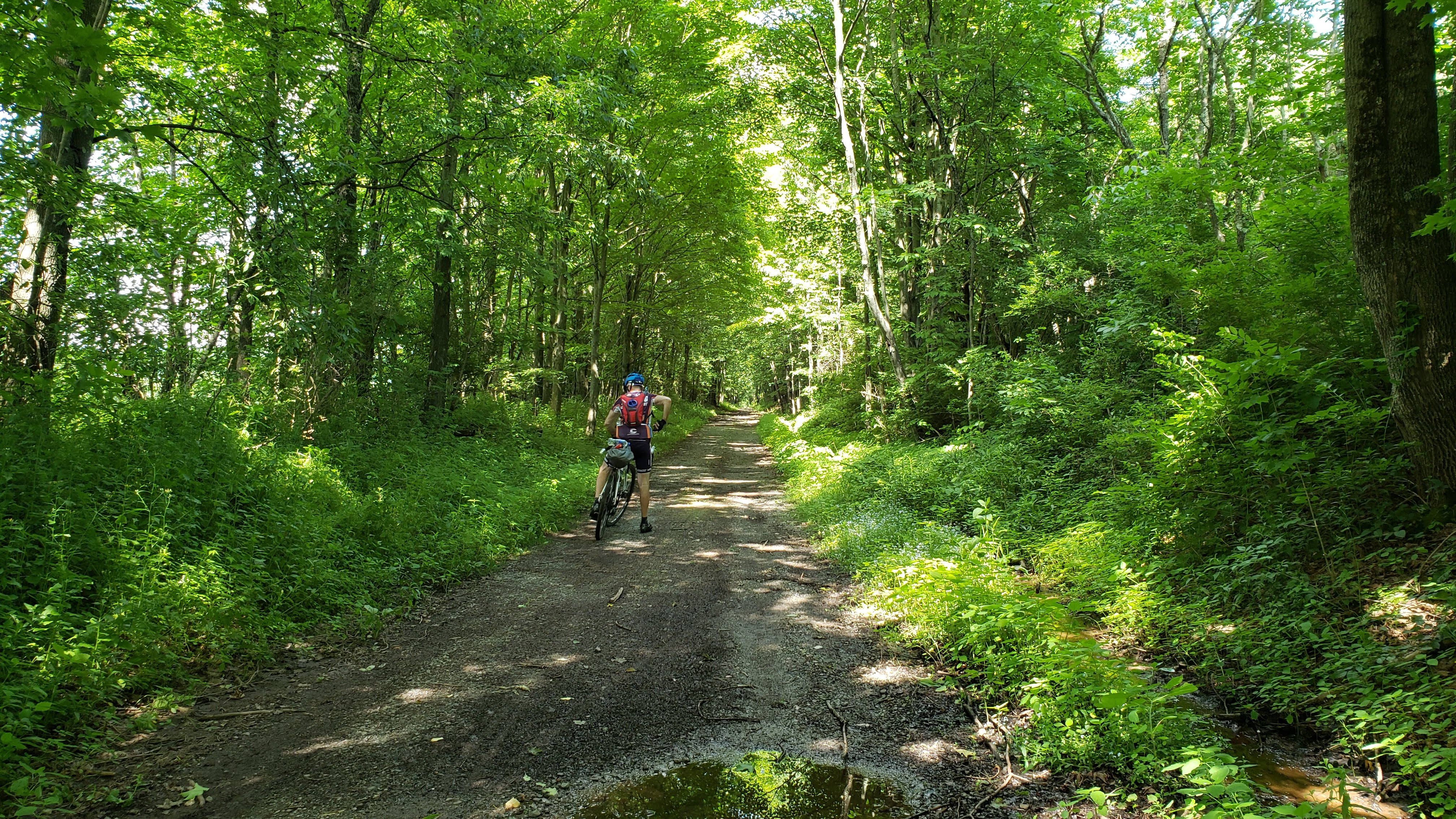 Coming off day 1 and seeing a forecast of even higher temps (near 90* F) and humidity paired with an additional 18 miles until our next overnight accommodations, we opted to leave earlier. Curt had to repair his front shifting cable so we ended up leaving only an hour earlier than Day 1. The morning chill was most welcome as we zoomed out of town and found our first good hill within a few miles. Today was Dirt Day and we knew there would be some formidable climbs in the latter half of the day. Dirt always takes a bit more energy than pavement but is generally mercifully shaded, which provides much needed respite from the sun.