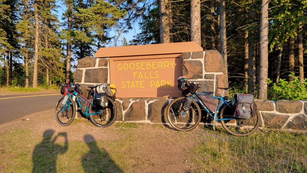 • Rolling into Gooseberry Falls State Park 7 minutes before the ranger station closed and scoring the only available place to put us, which happened to be the best spot in the campground. (Minnesota, Michigan, and Wisconsin have a No Turn Away policy for bicycle travelers who need accommodations at campgrounds even if they are full.)