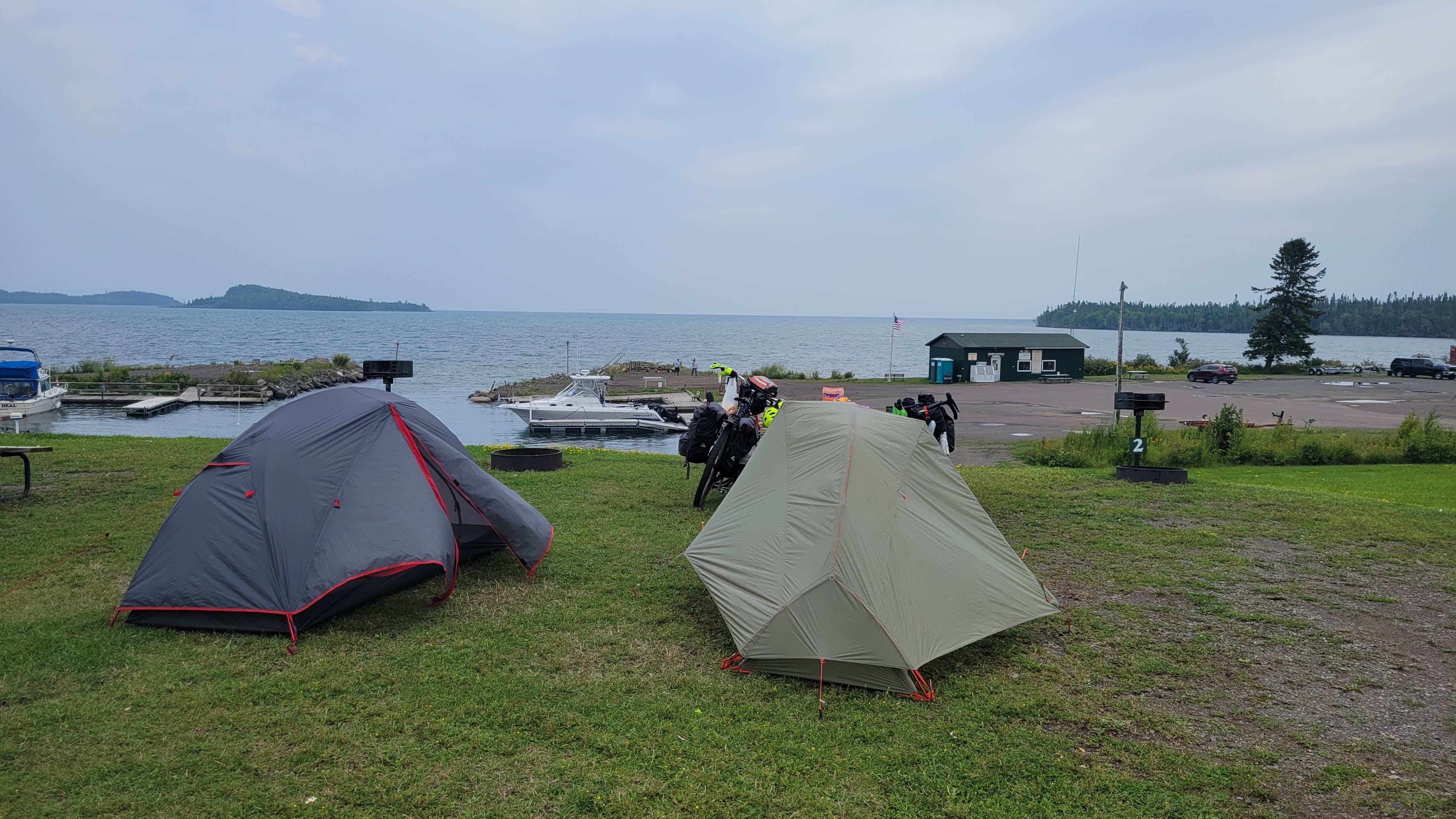 • Setting up camp at the Grand Portage Marina, which feels like the edge of the world, especially with the strong winds coming off the bay