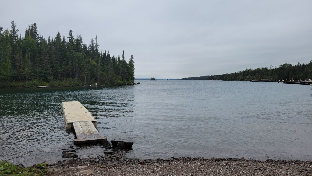 Sure enough, Lake Superior was in a fine mood and we both felt nauseated despite the anti-motion sickenss meds. A steady stream of Gin Gin hard candies kept things down for us (but others were “feeding the fishes” off the back). Two hours later, we pull into Windigo dock for our park orientation.