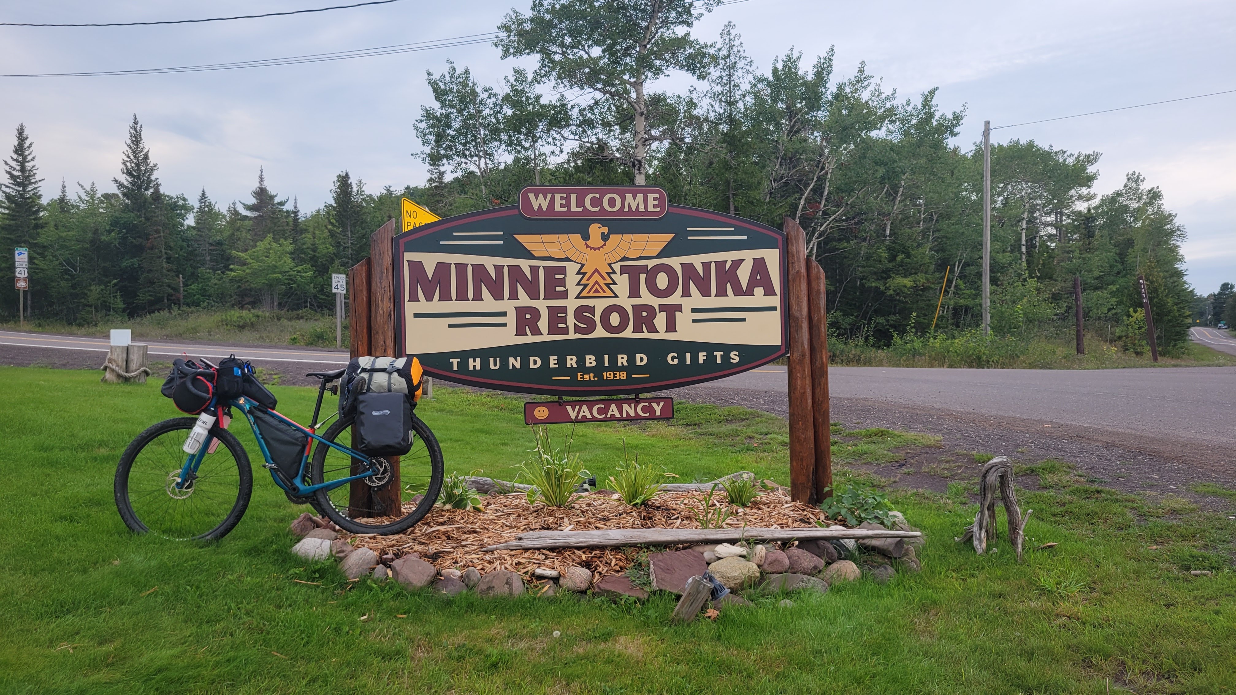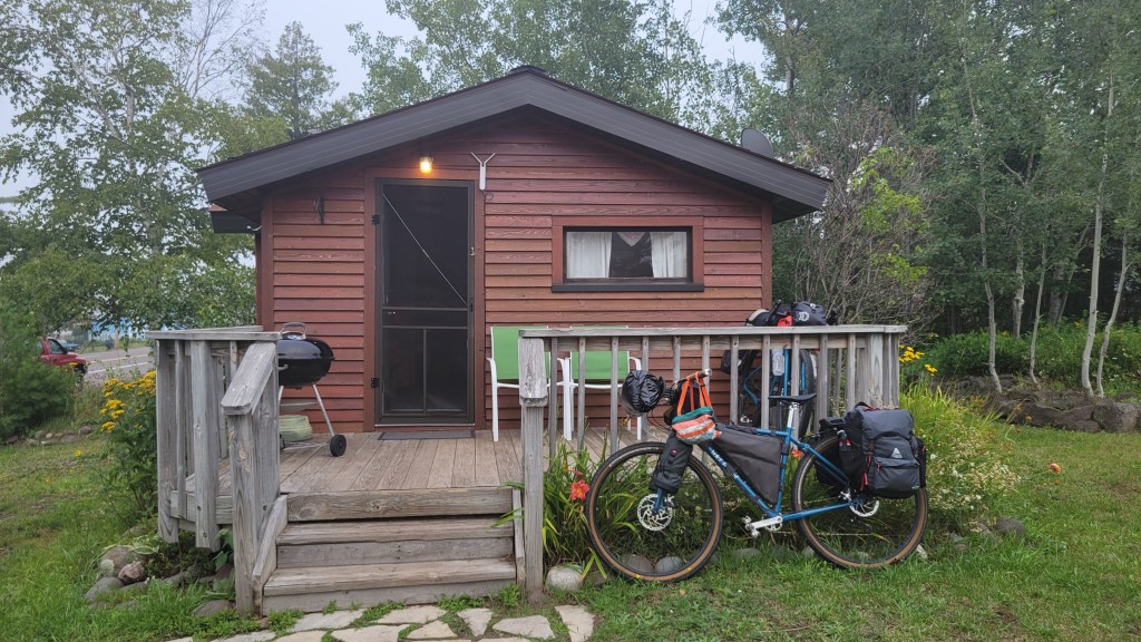 We landed at the dock and got our bicycles and gear from the ferry. Somehow my fork had been loosened and it wasn’t lining up with my handlebars – but we were only two blocks from our cabin at the Minnetonka Resort for the night so we walked up there, got the keys, and tightened up the fork.