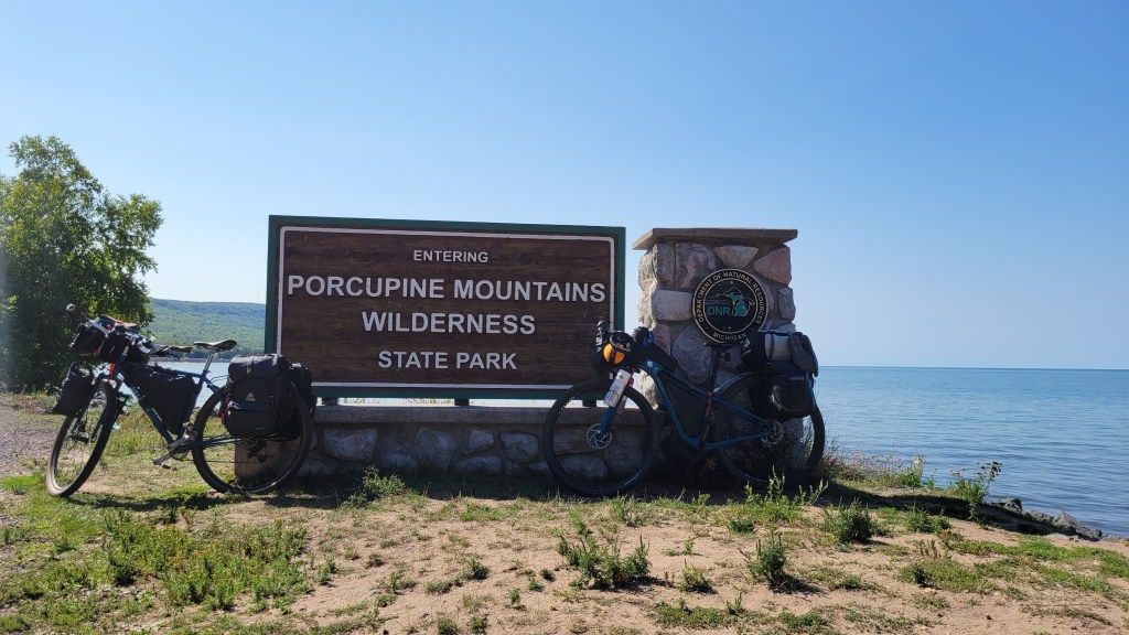 • We pre-rerouted Day 3 in Michgan because the intended route would have been 70 miles and we’re starting to feel tired from hauling 40 pounds of stuff on unforgiving chunky roads. We followed the route until Mass City, which we then jumped on the road and headed up to Ontonagon, along Lake Superior, and into the Porcupine Mountain Wilderness Area.