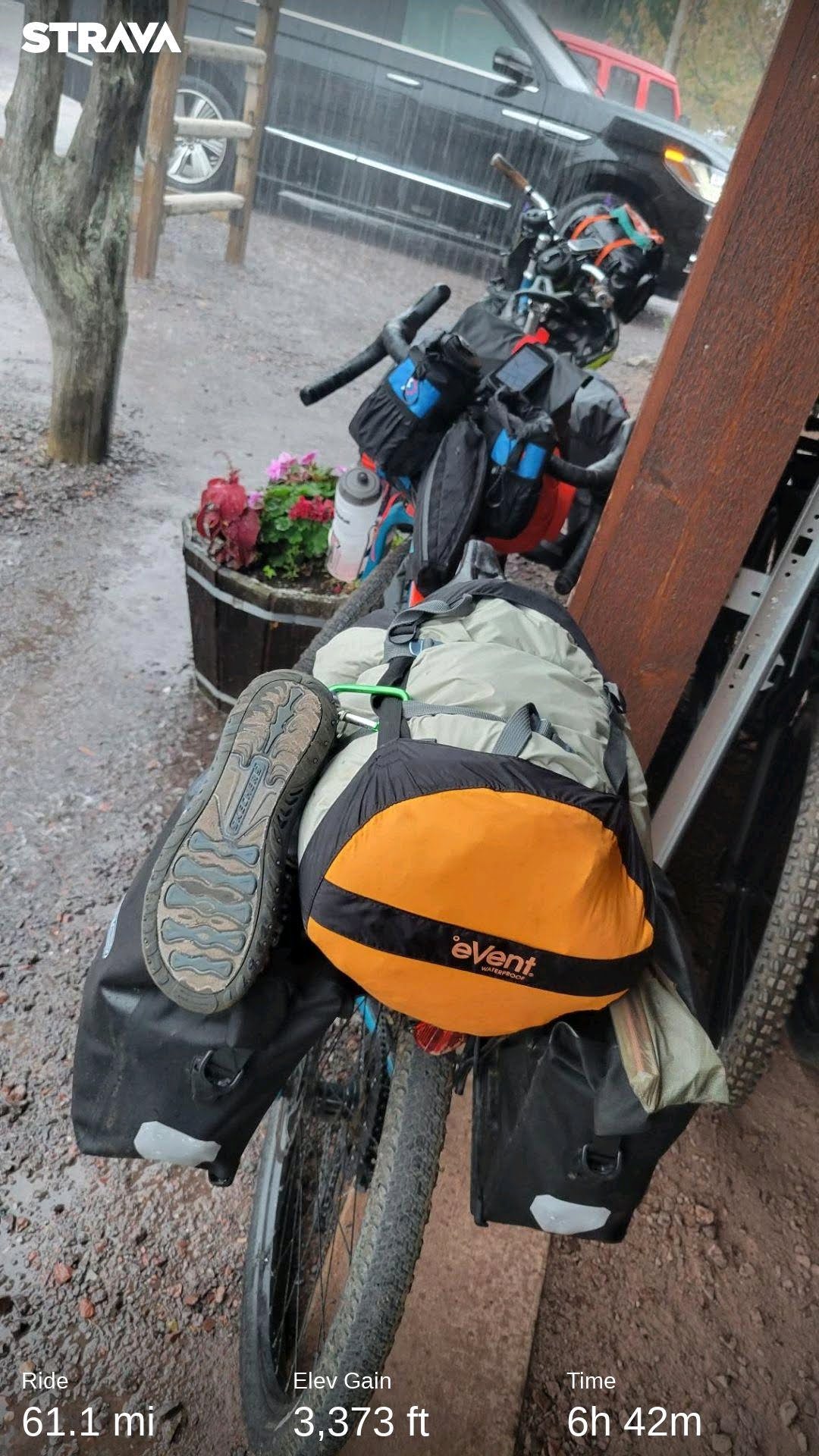 To be sure, this 2- week adventure was out of our collective comfort zones. Neither of us has done a bikepacking trip of this length, much less with most of the accomodations as camping. Camping adds a layer of stress above the usual miles and load – survival is at stake. Setting up camp, making a meal, cleaning up after the meal, making sure everything is bear proof/bear safe … it’s a lot of psychological stress.