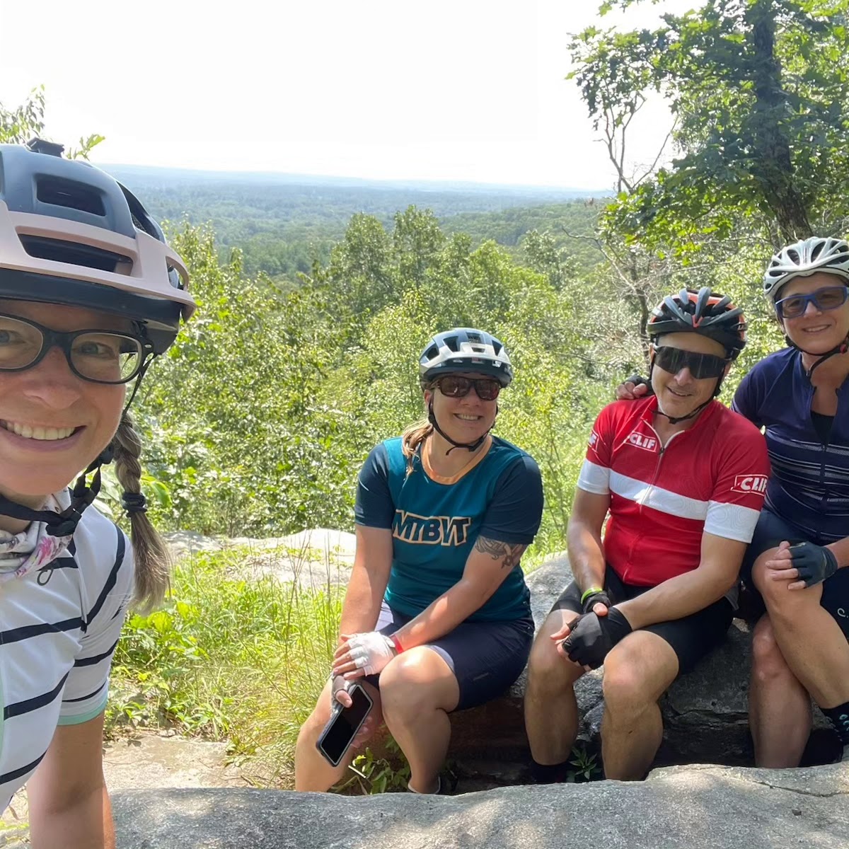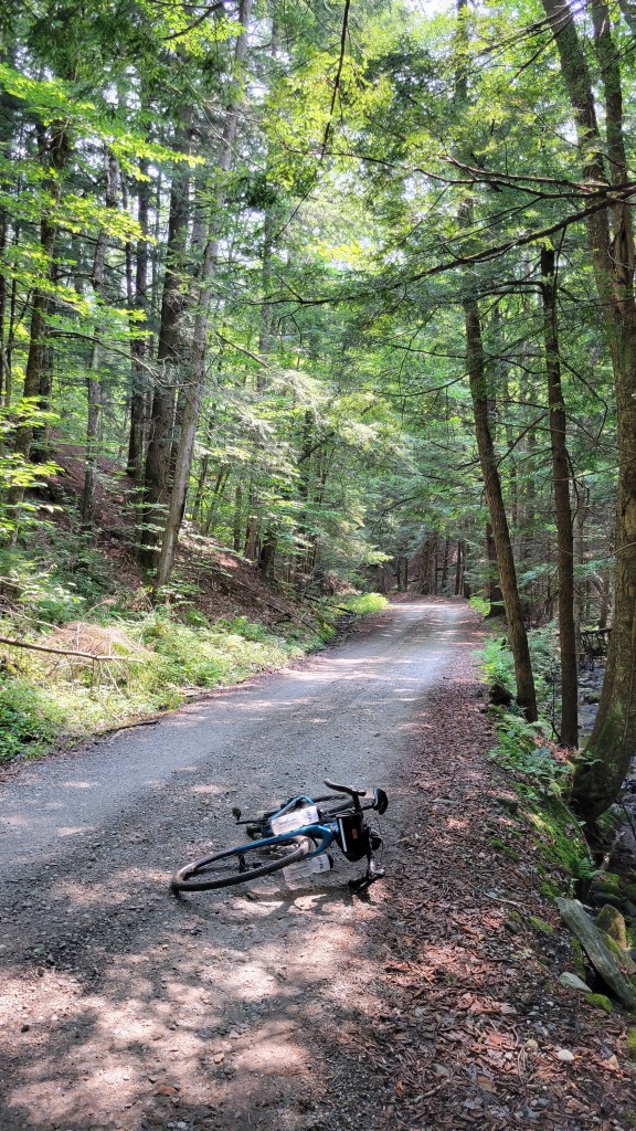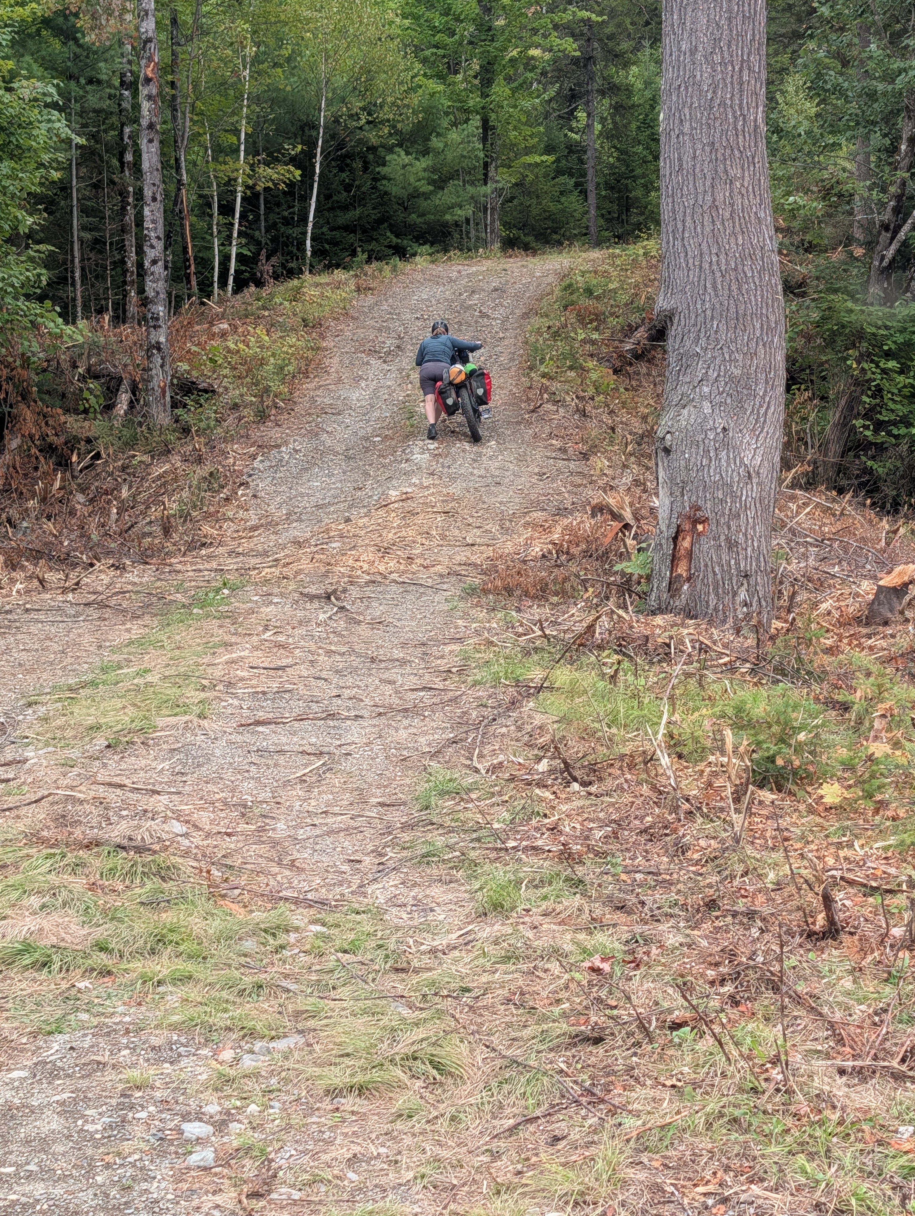 After lunch was a huge hike a bike up a long logging road two track. None of our photos show the actual steepness of the inclines, which challenged our upper body strength pushing our loaded bikes over rocky, uneven terrain.