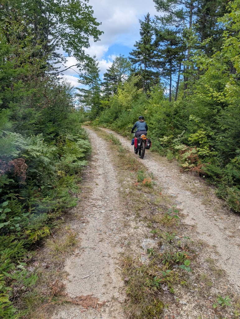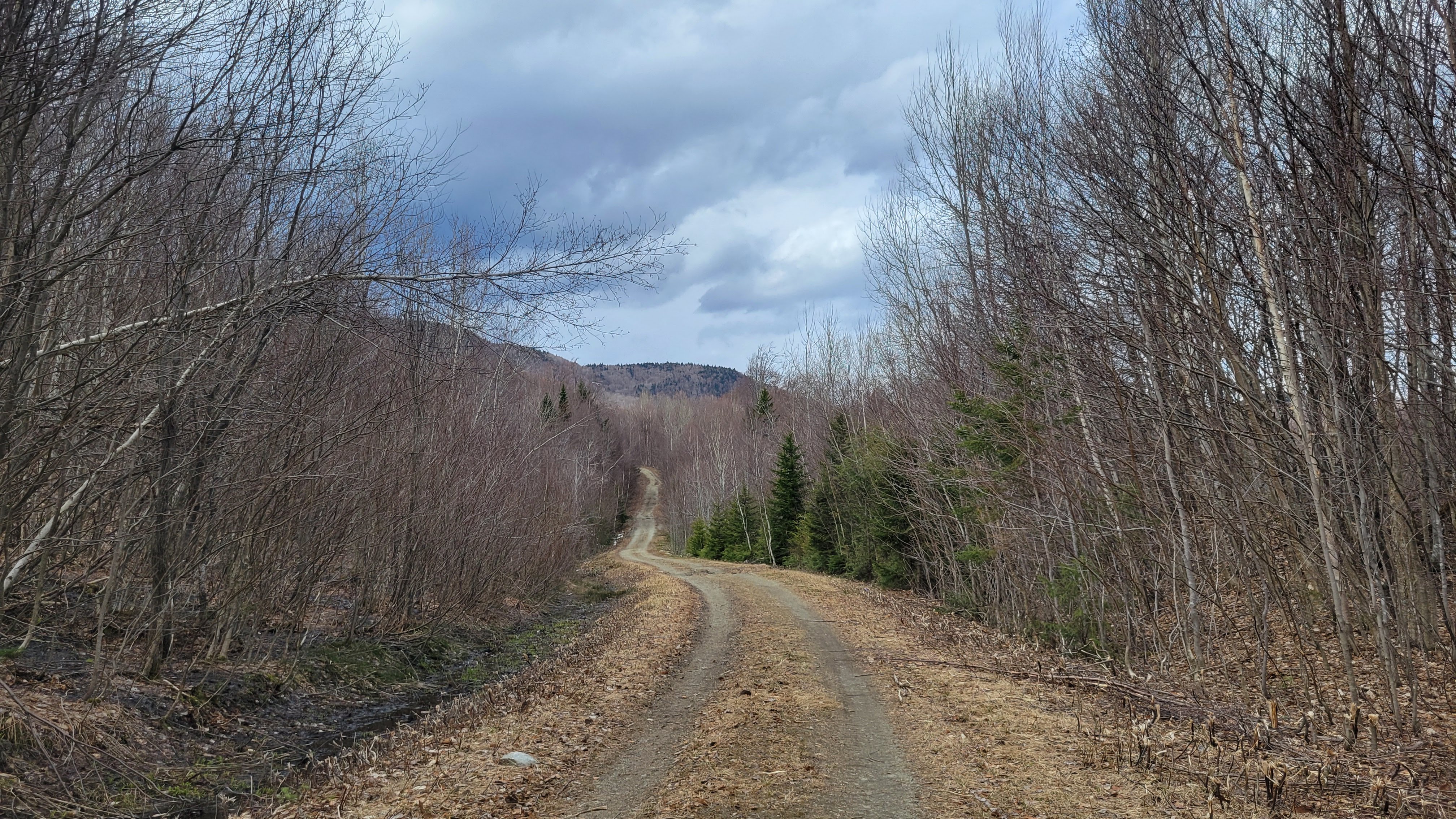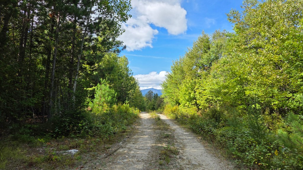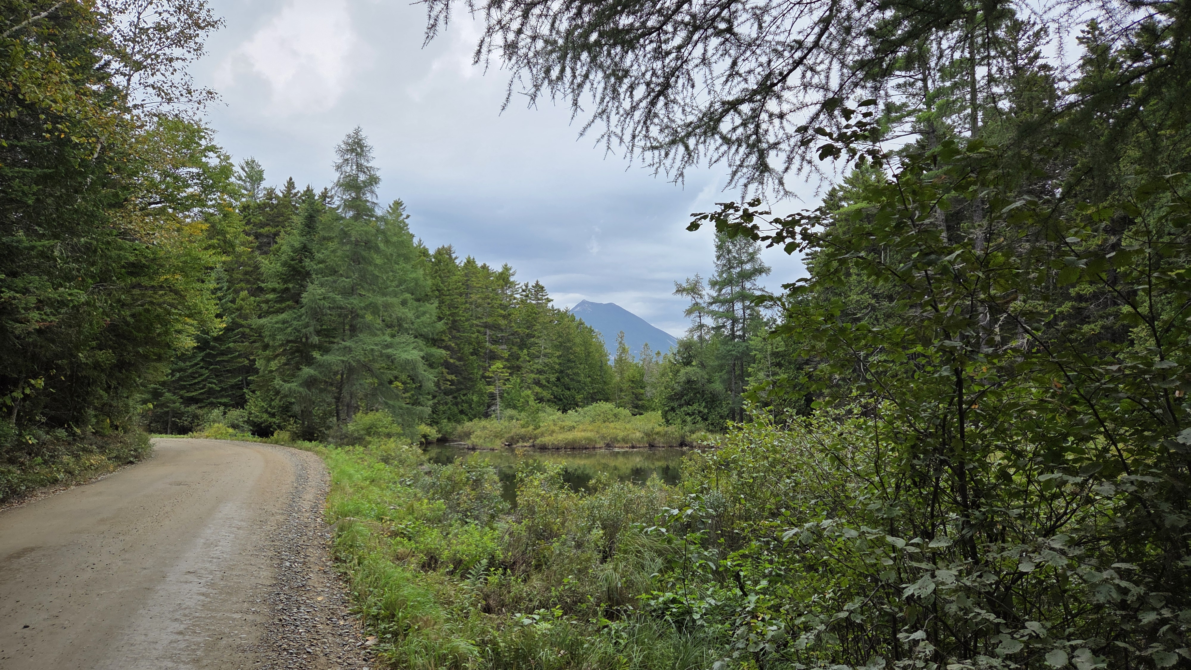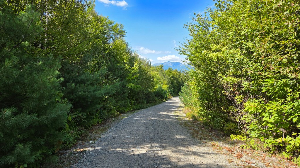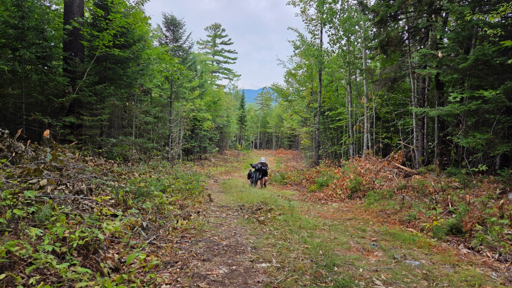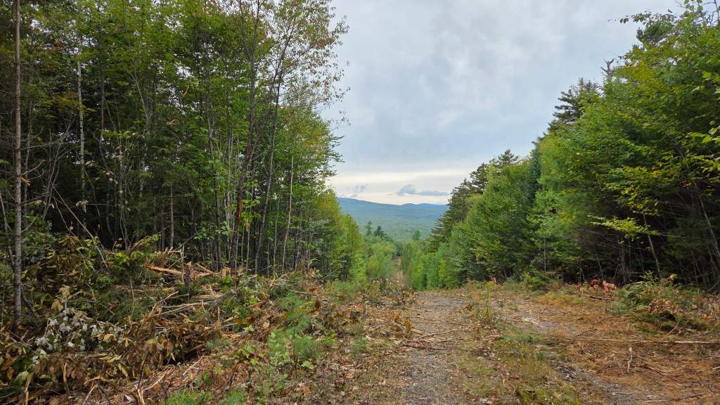 We head out on a wonderful snowmobile trail before turning onto logging roads. We stop for lunch on the side of the road with a beautiful view of Katahdin. The logging road starts to be more two-track and then devolves further into an overgrown mess of rocks, moss, and thick leaves.