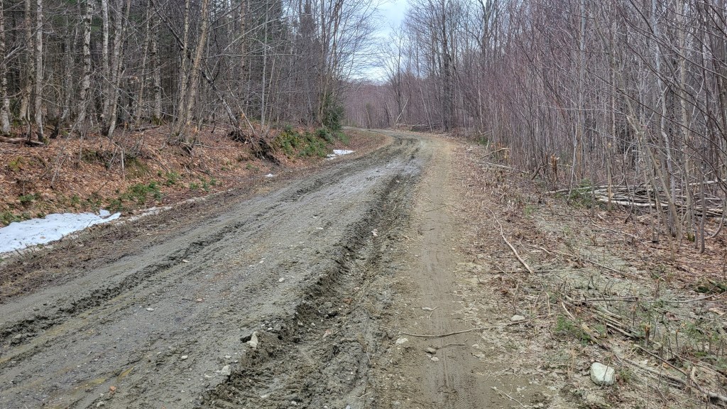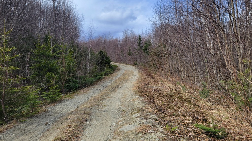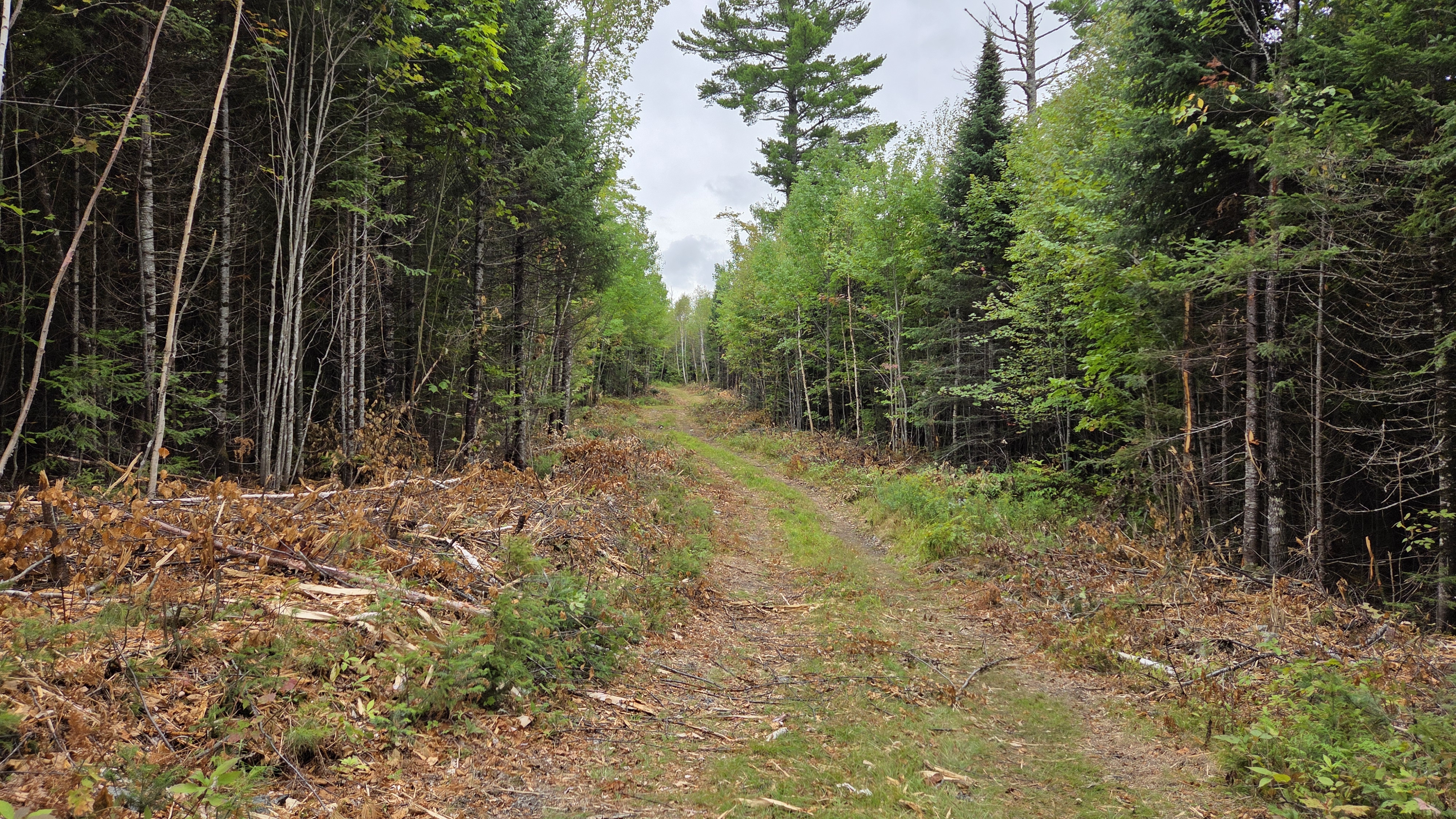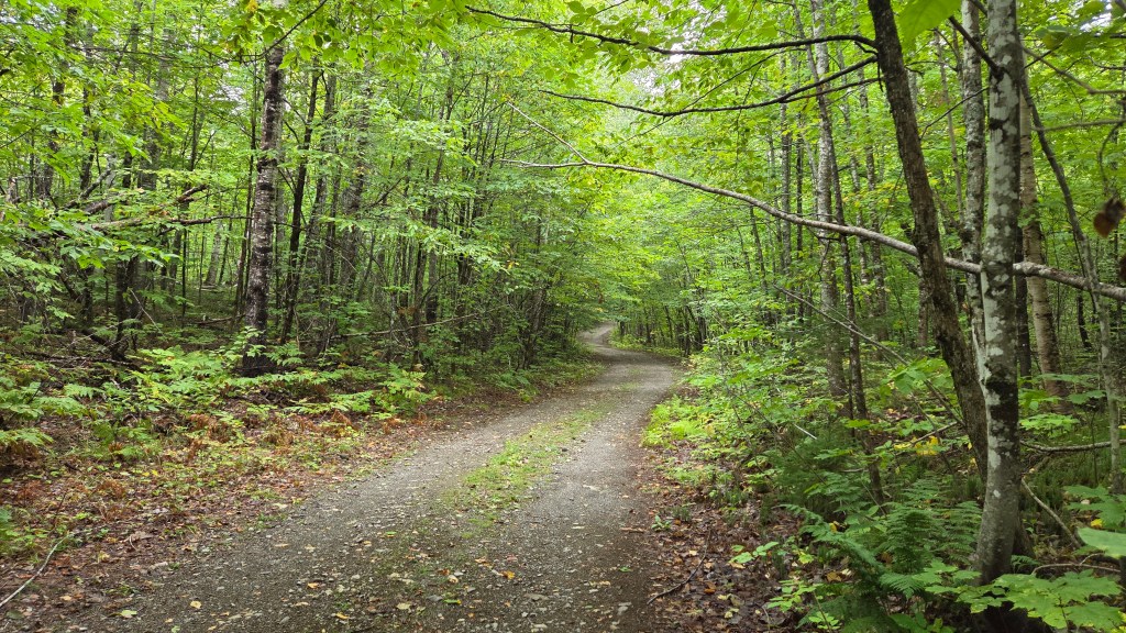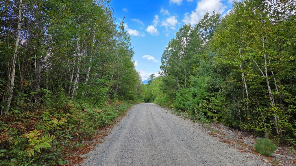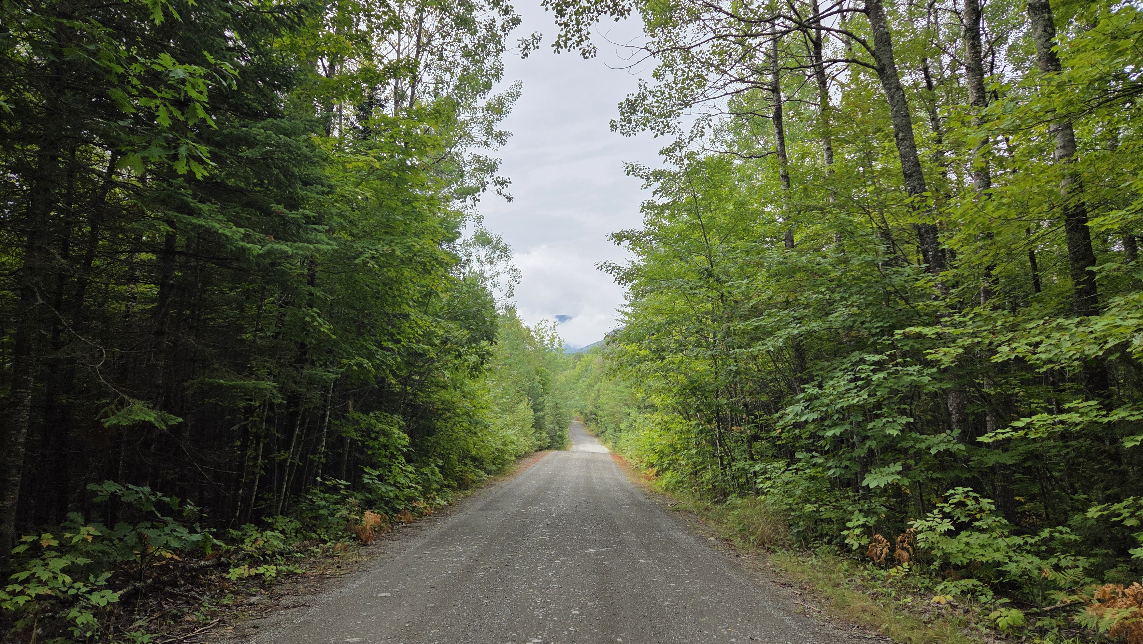 We head out on a wonderful snowmobile trail before turning onto logging roads. We stop for lunch on the side of the road with a beautiful view of Katahdin. The logging road starts to be more two-track and then devolves further into an overgrown mess of rocks, moss, and thick leaves.