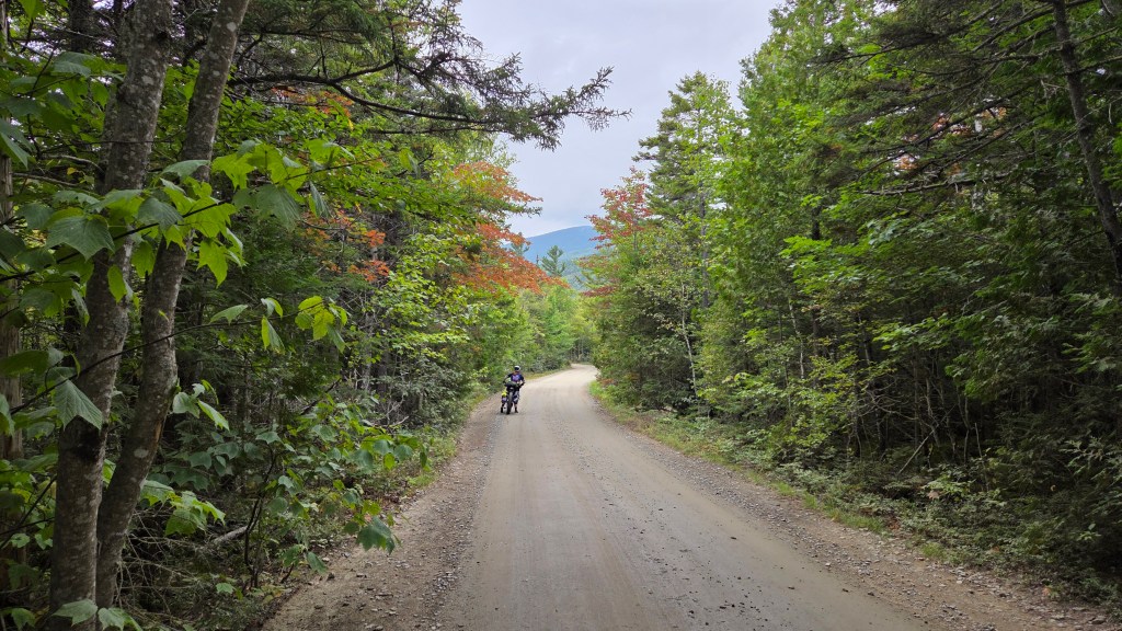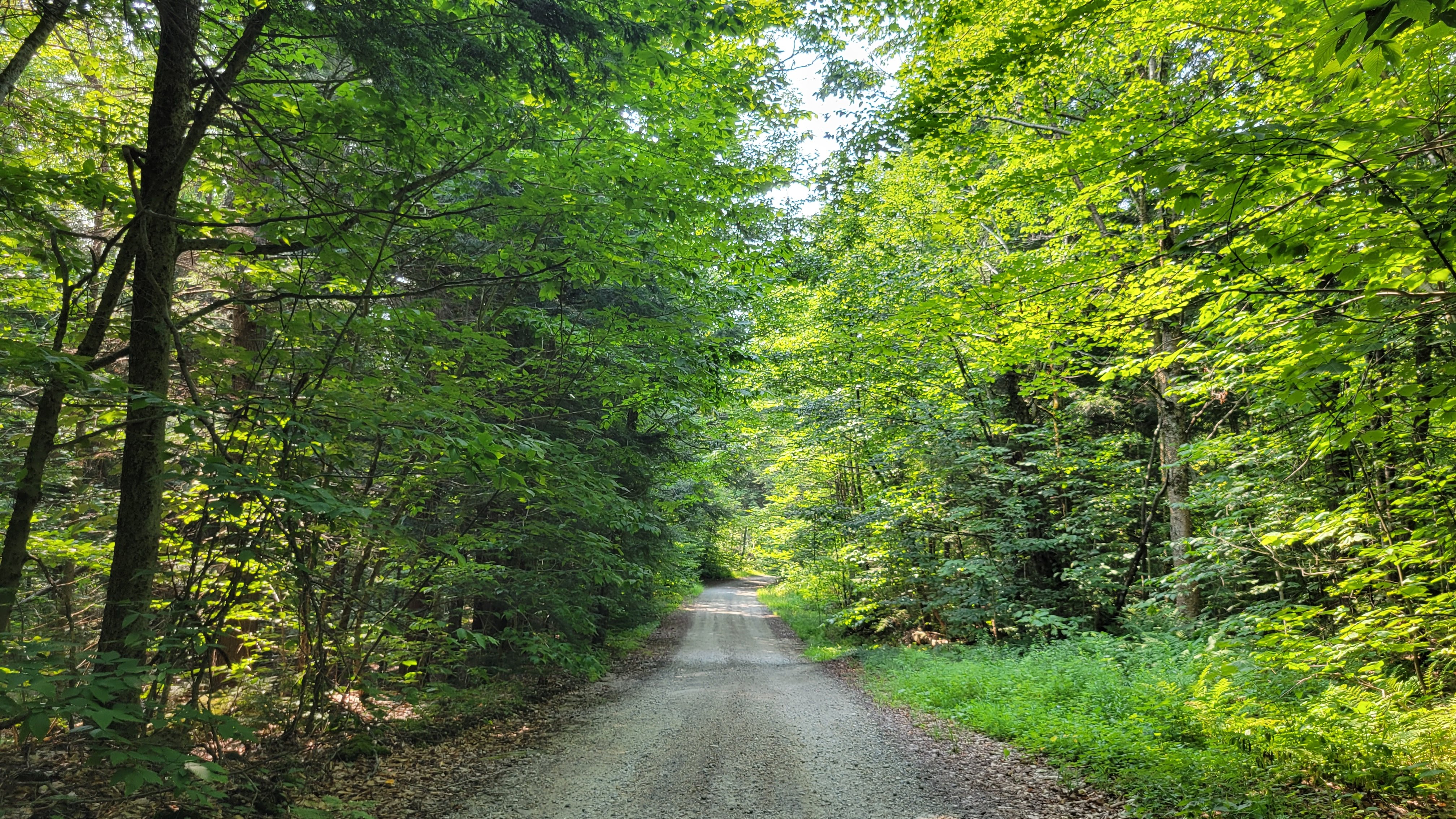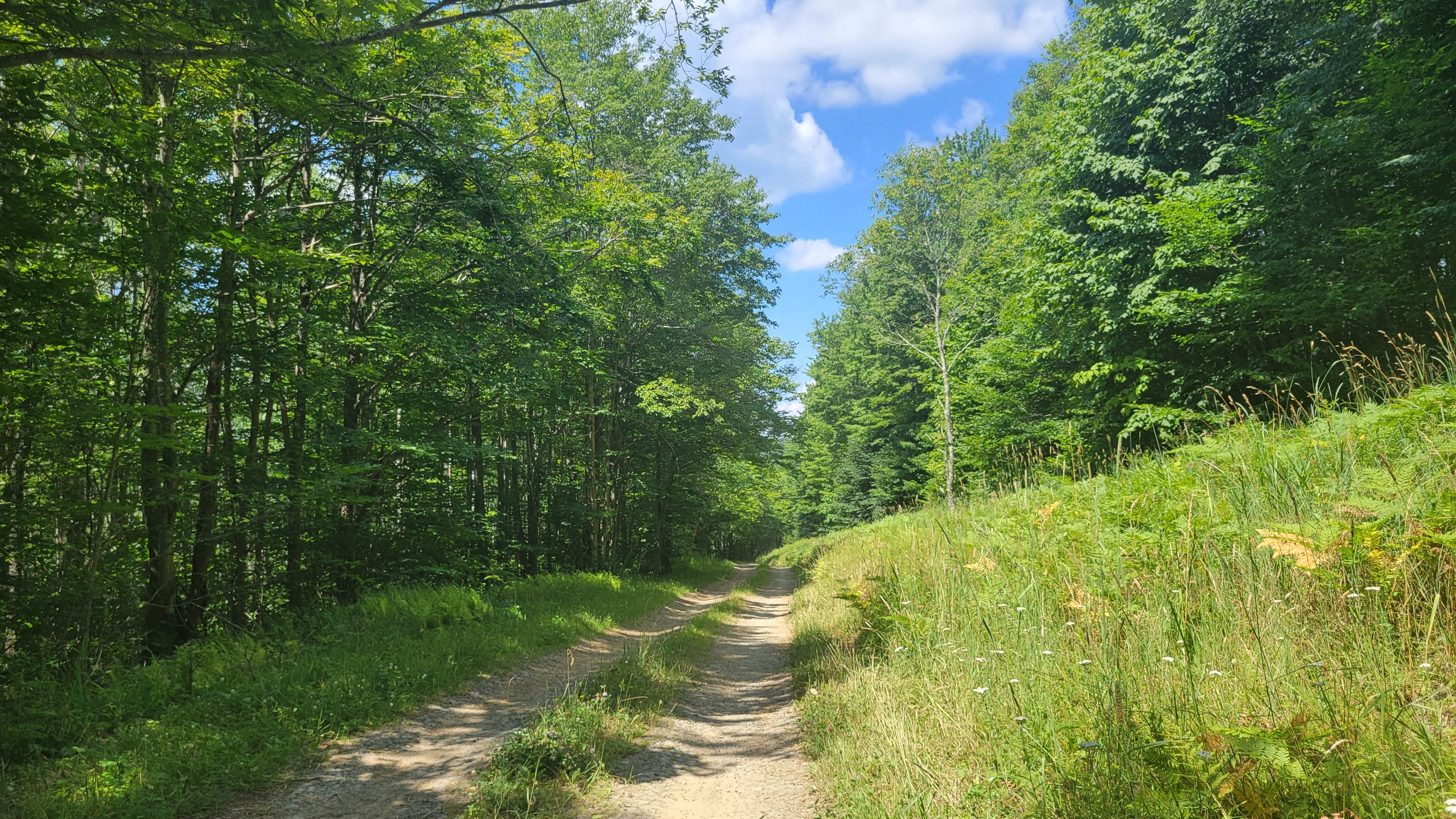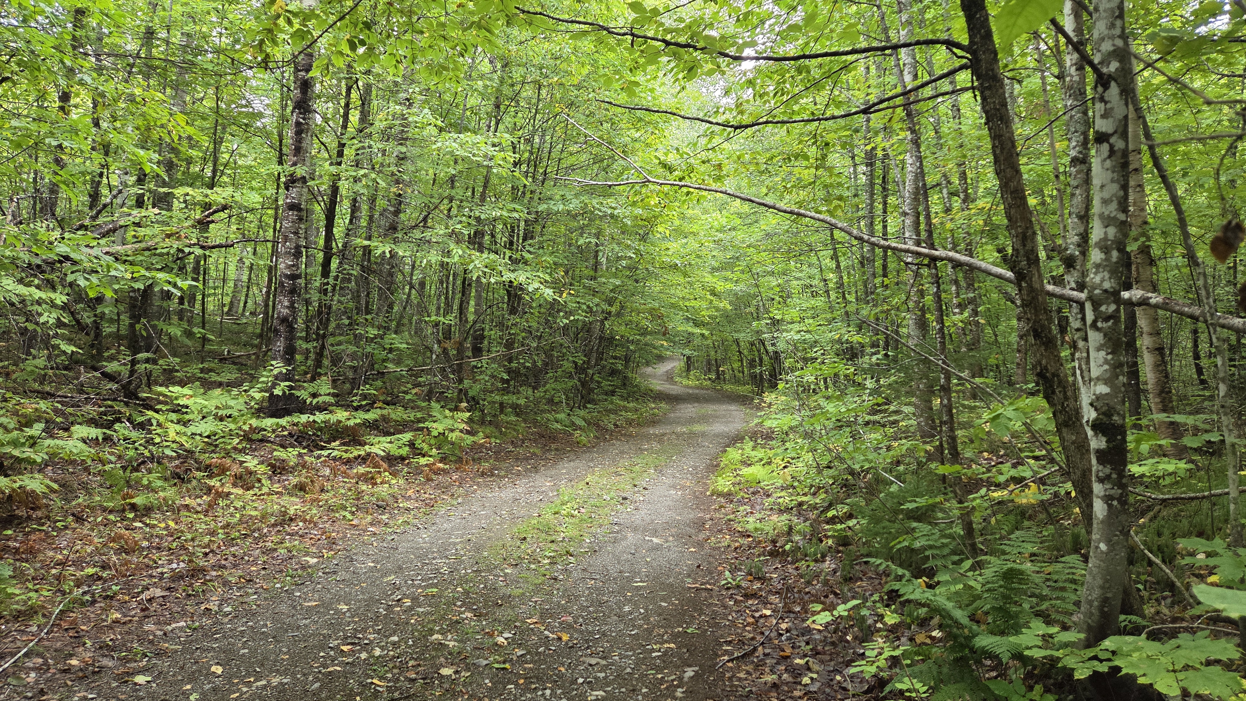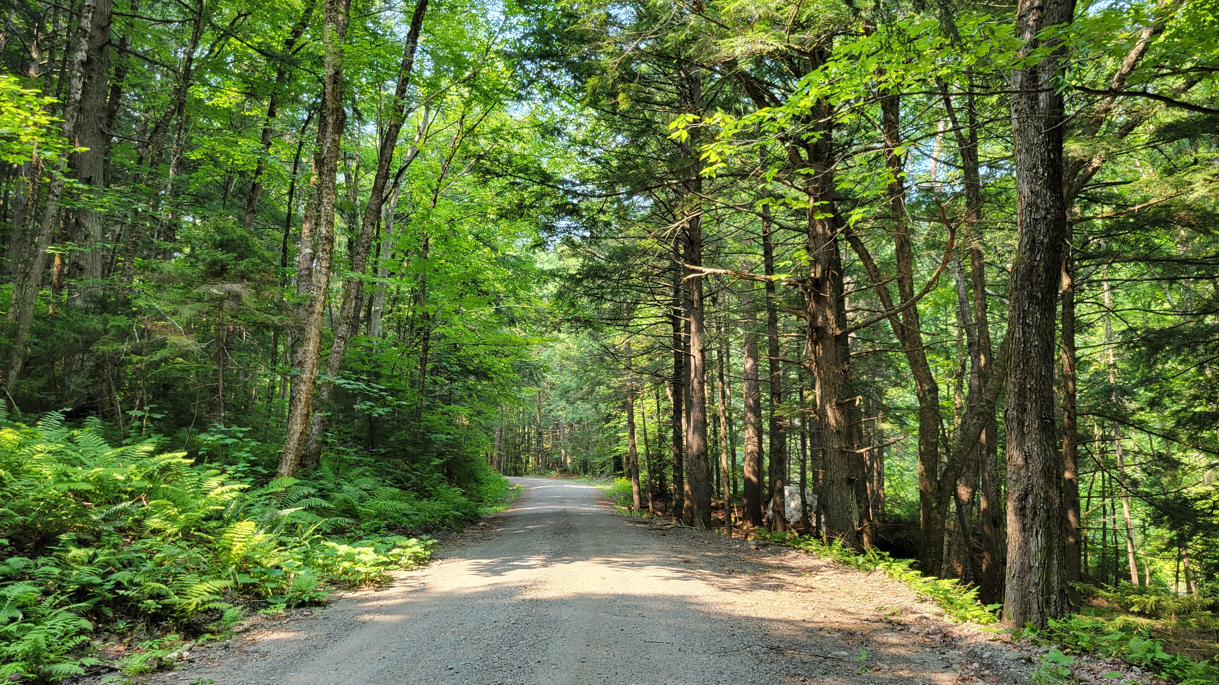 We head out on a wonderful snowmobile trail before turning onto logging roads. We stop for lunch on the side of the road with a beautiful view of Katahdin. The logging road starts to be more two-track and then devolves further into an overgrown mess of rocks, moss, and thick leaves.