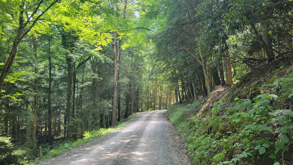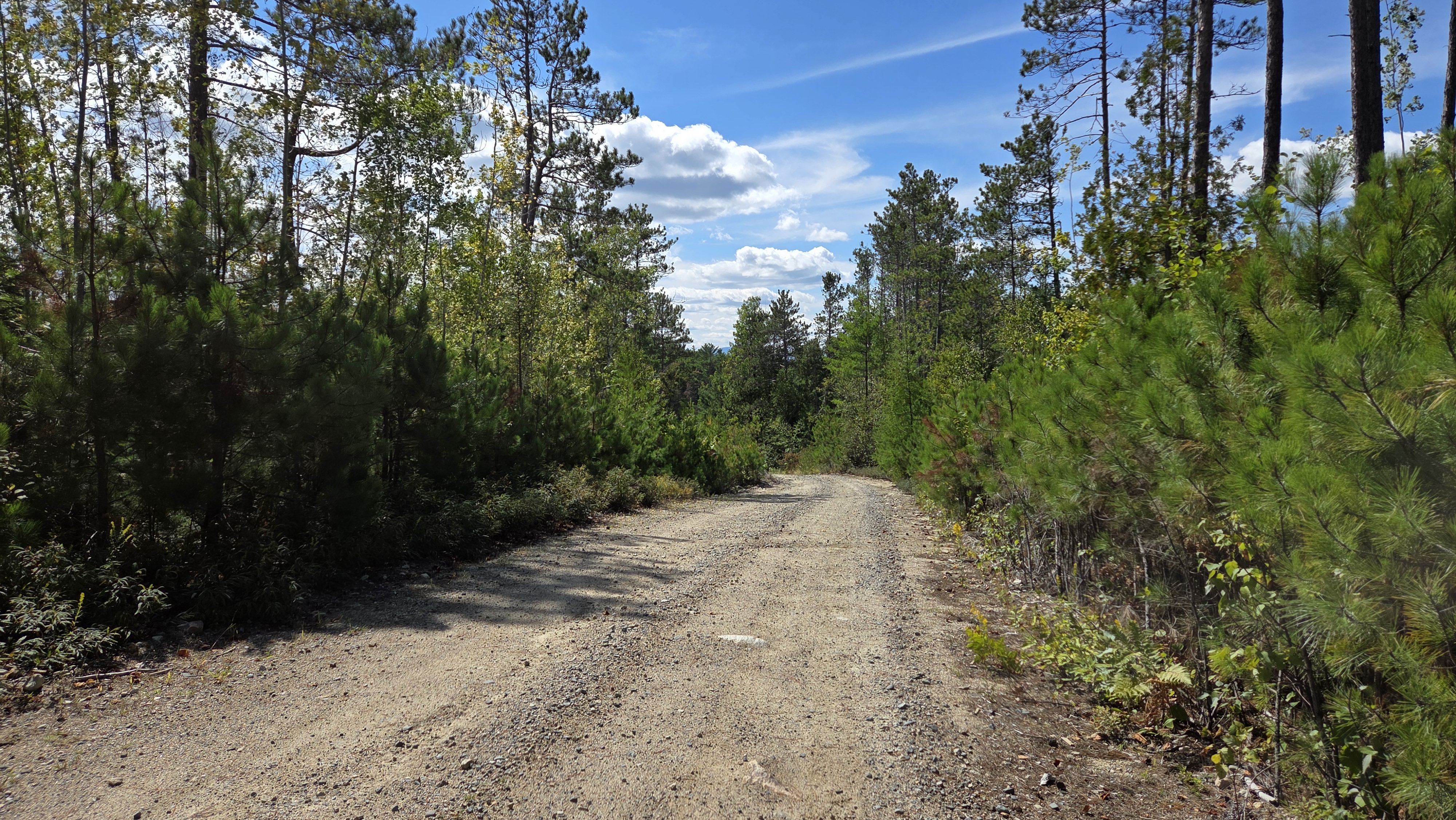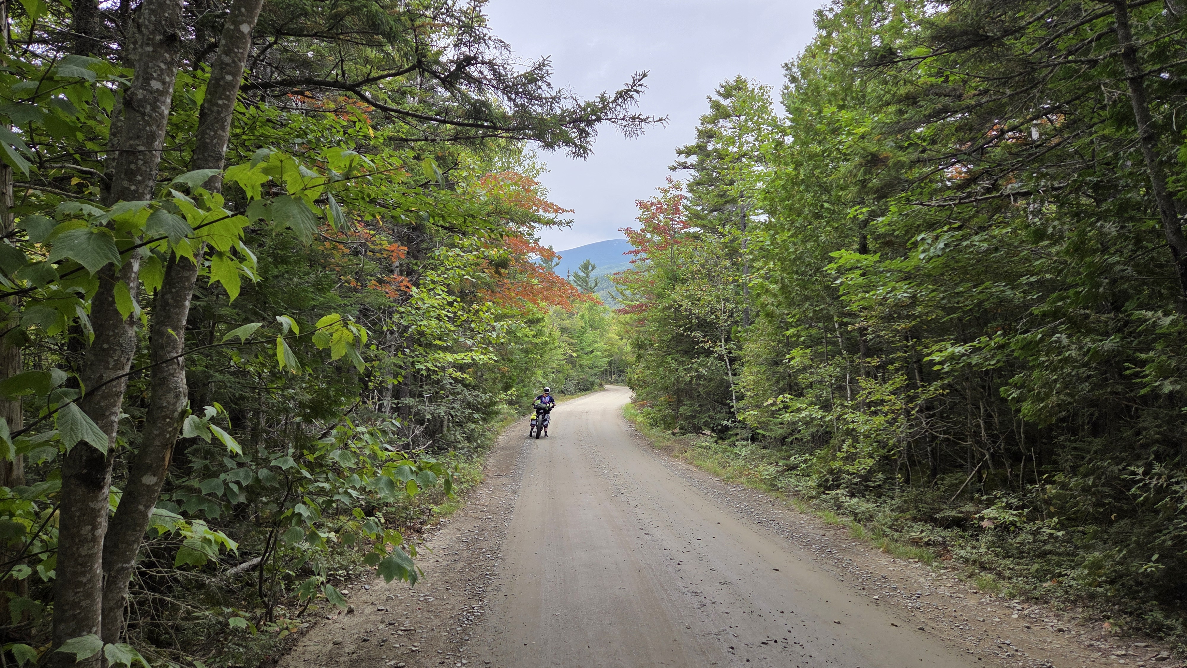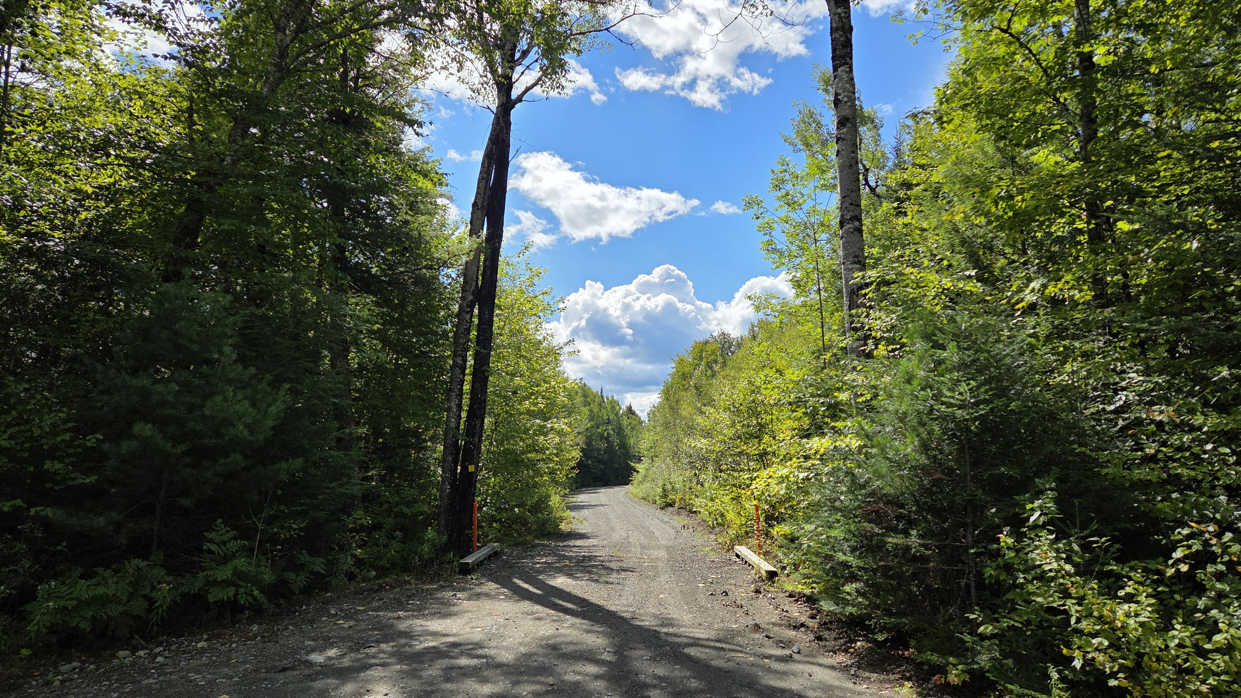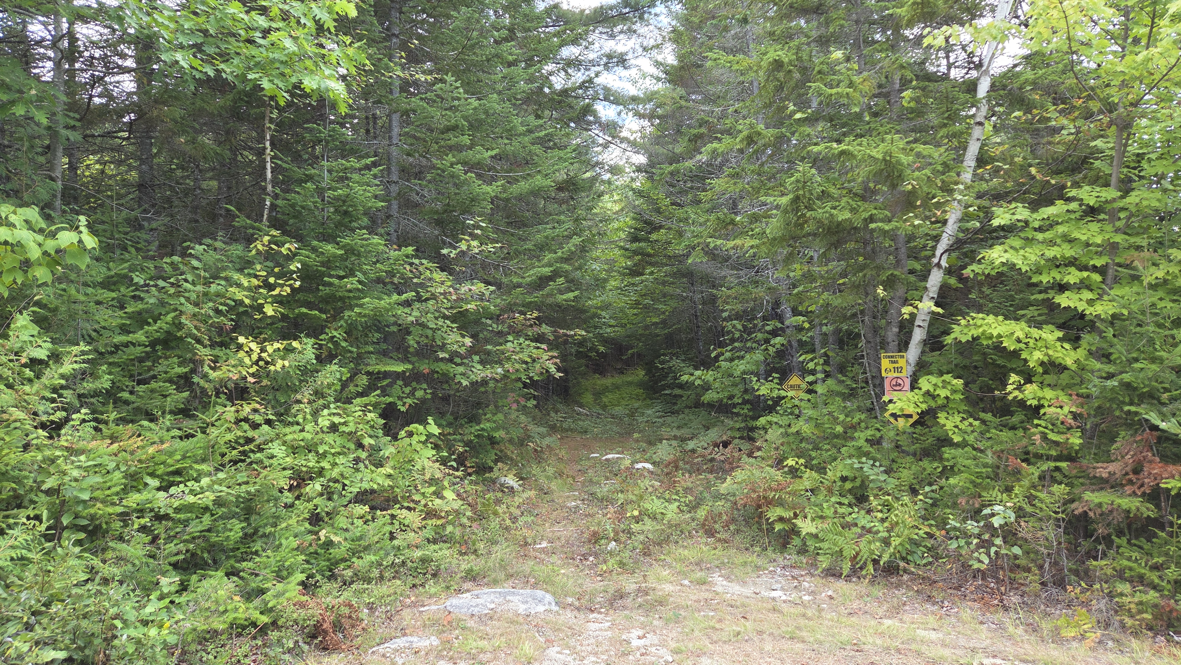 We head out on a wonderful snowmobile trail before turning onto logging roads. We stop for lunch on the side of the road with a beautiful view of Katahdin. The logging road starts to be more two-track and then devolves further into an overgrown mess of rocks, moss, and thick leaves.