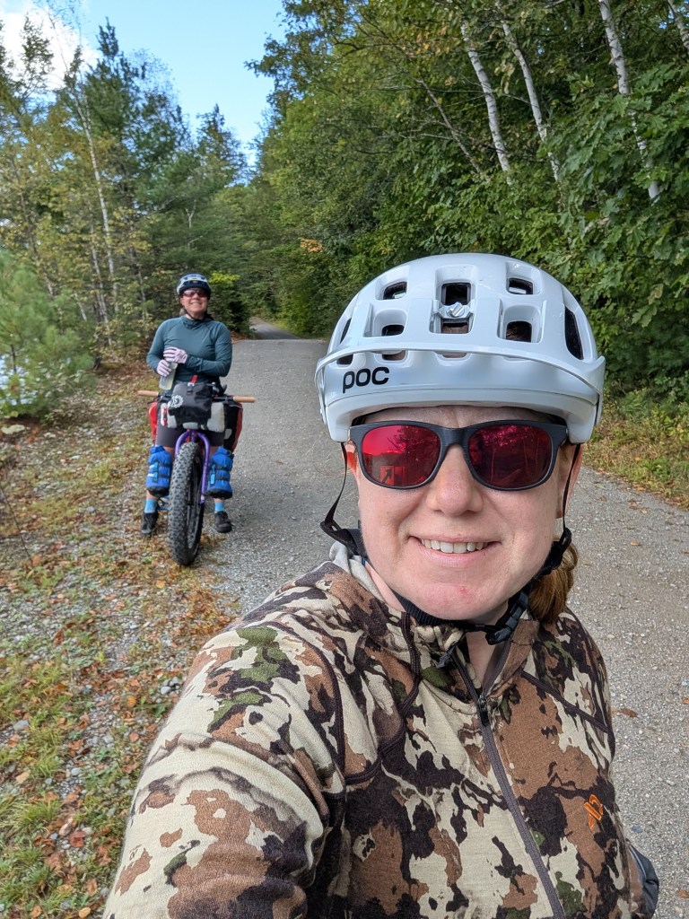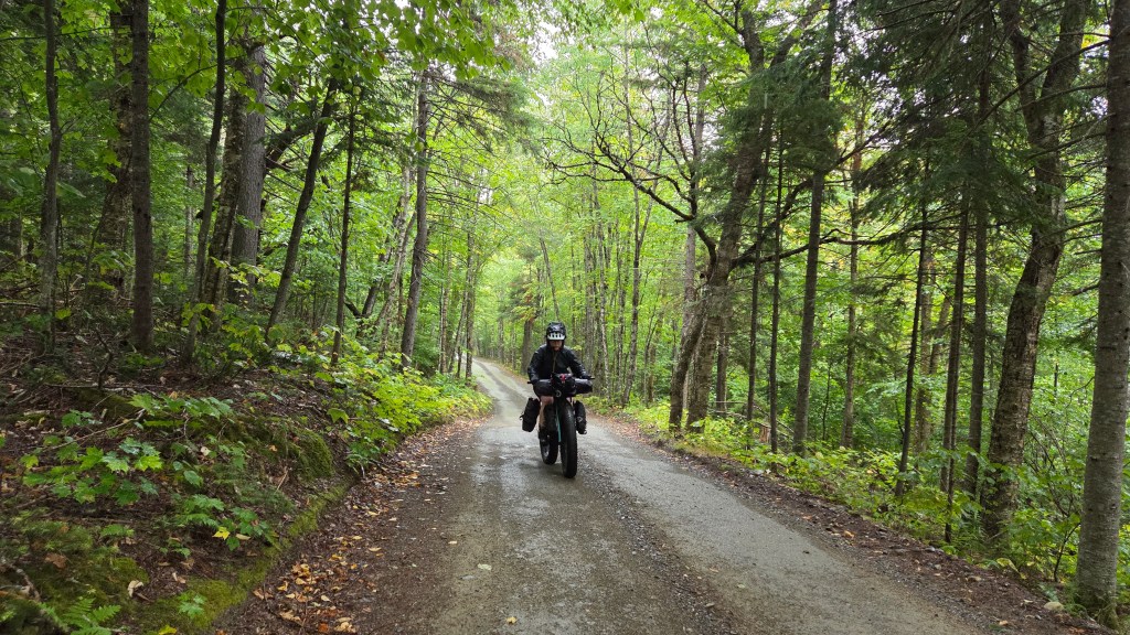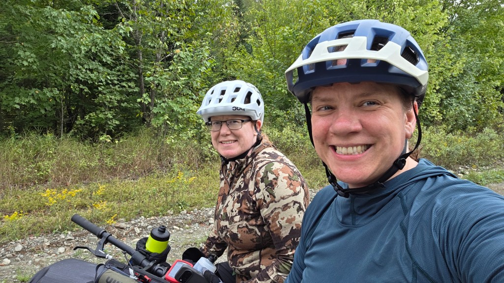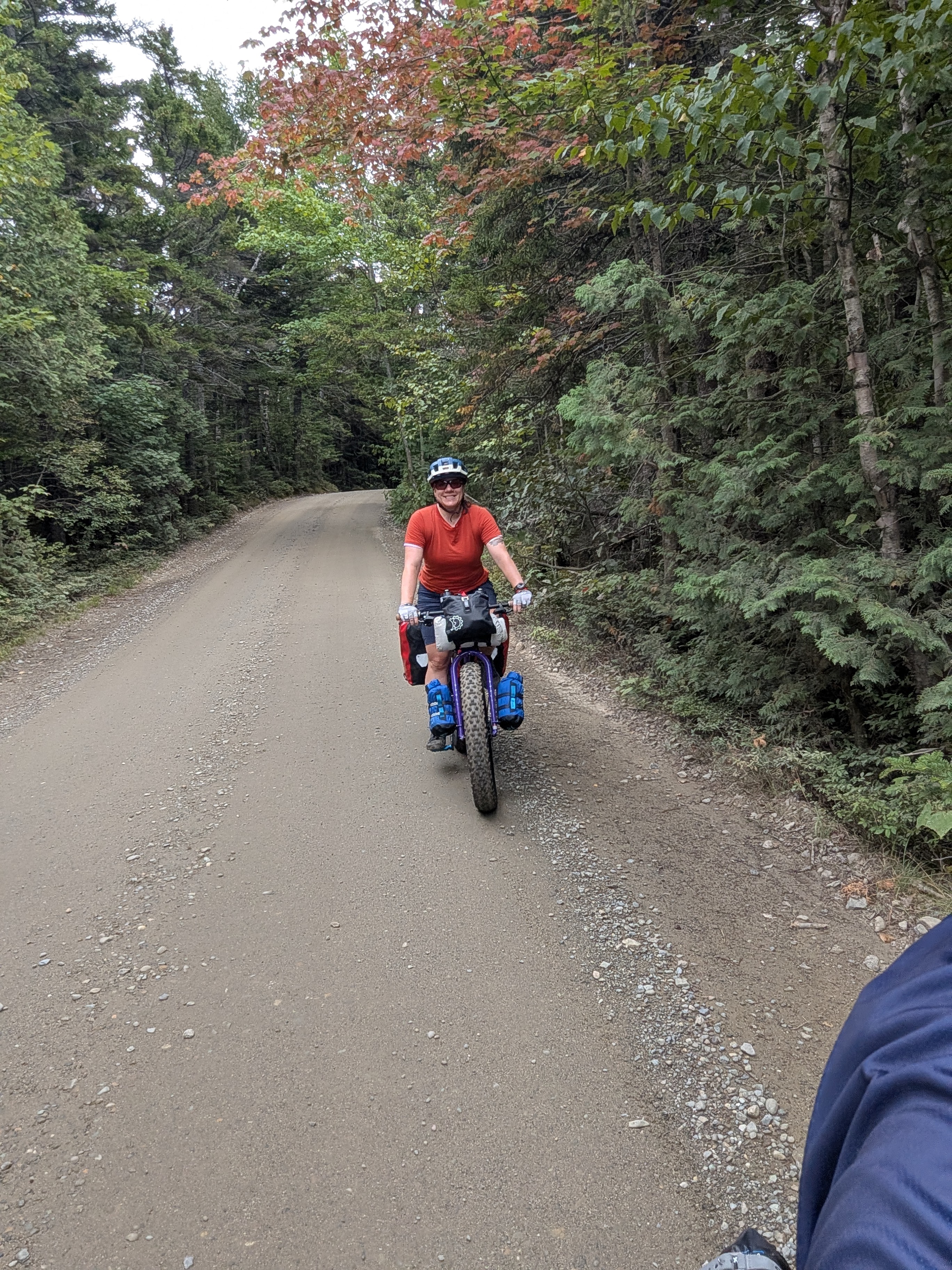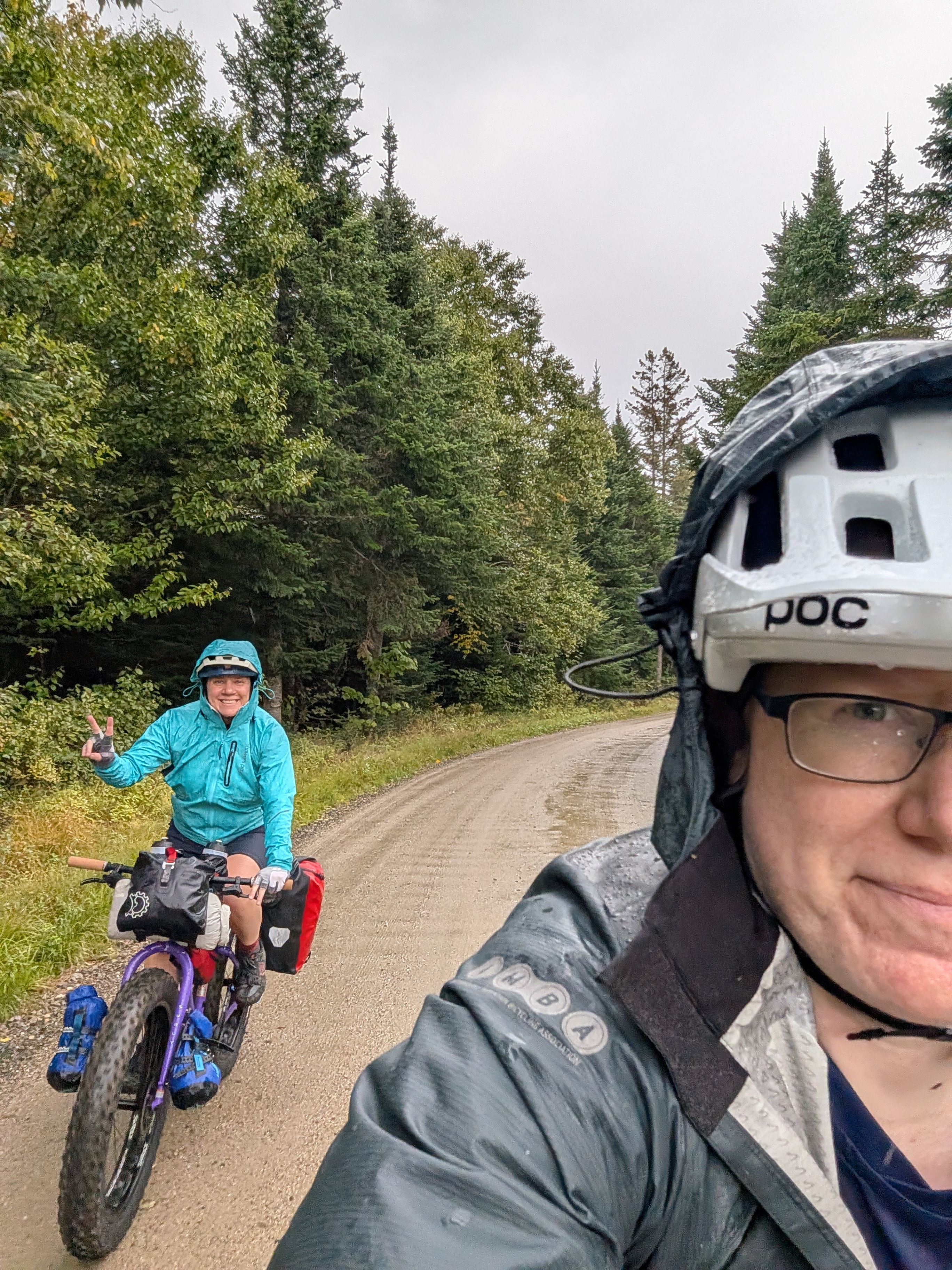 Thoroughly soaked through, we arrived at the Matagamon Gate and surrendered our pass to the Ranger, who was asking if we were on e-bikes. No e-bikes here – just analog human-powered transportation! A woman took our photo to send to her husband who is on the Great Divide Route right now.