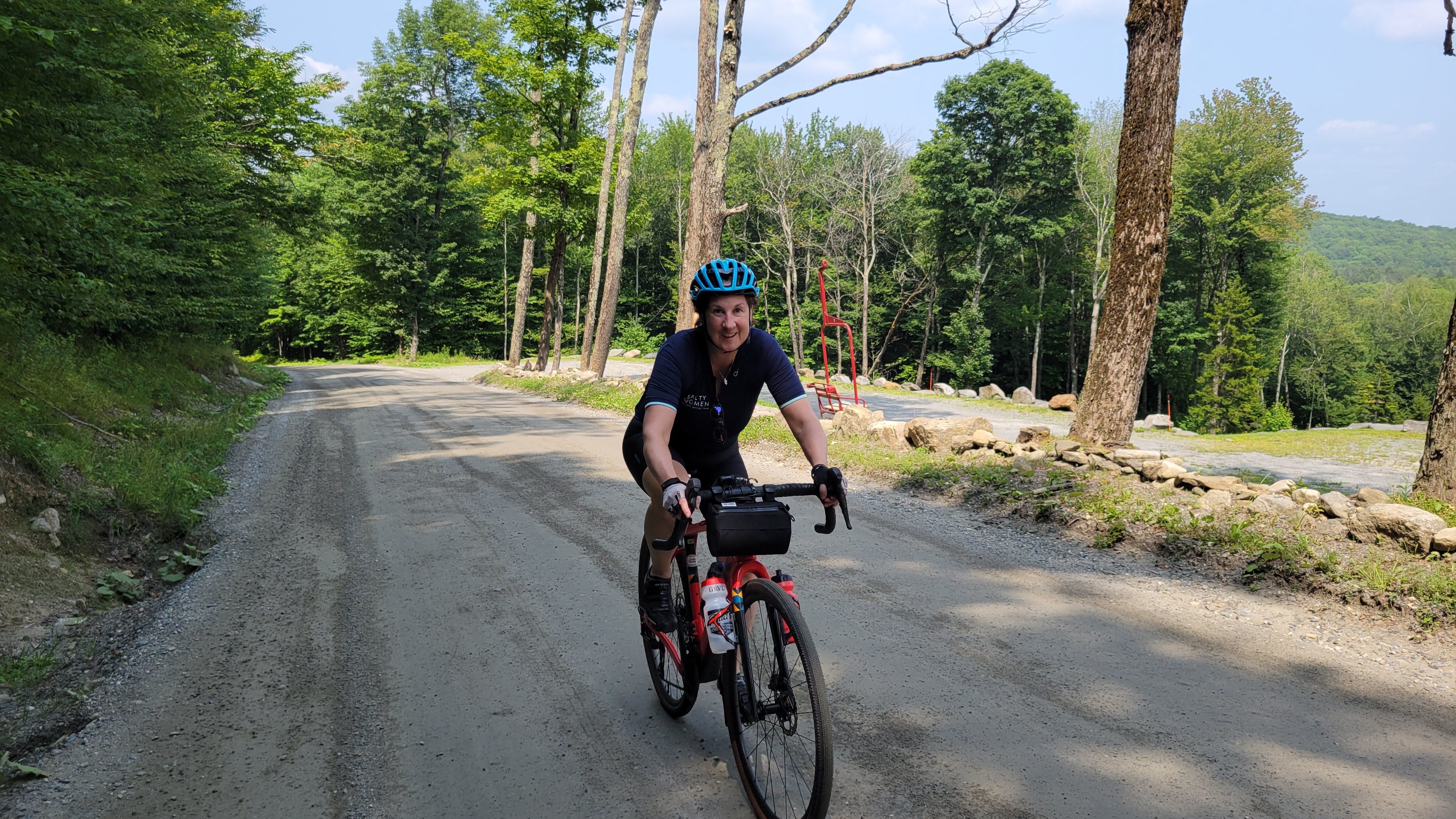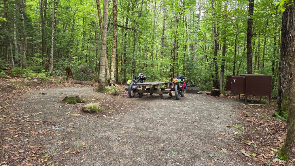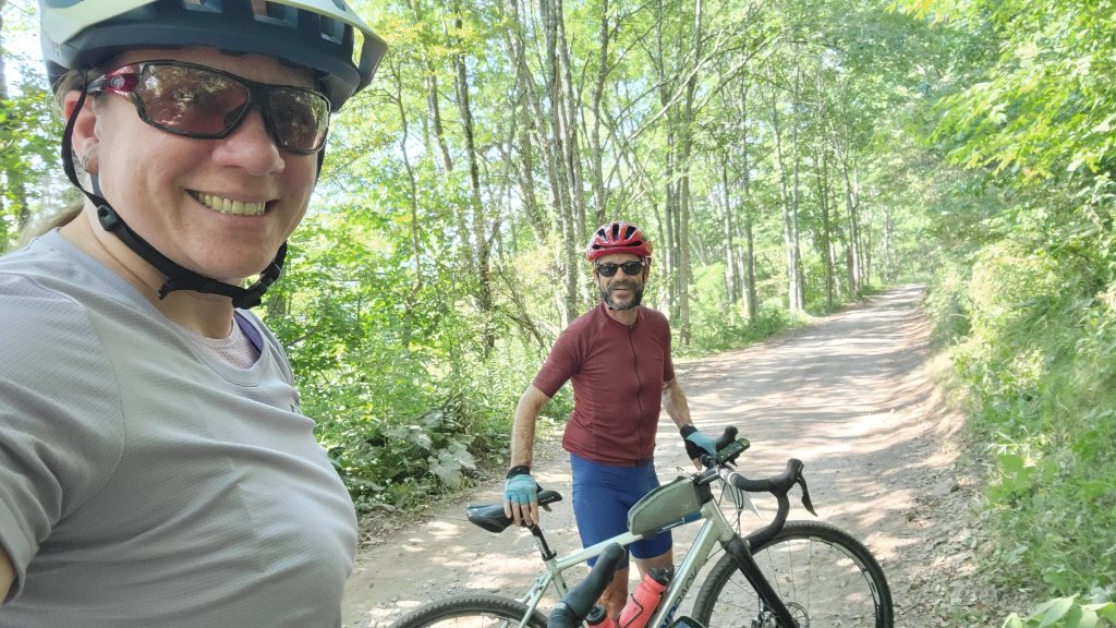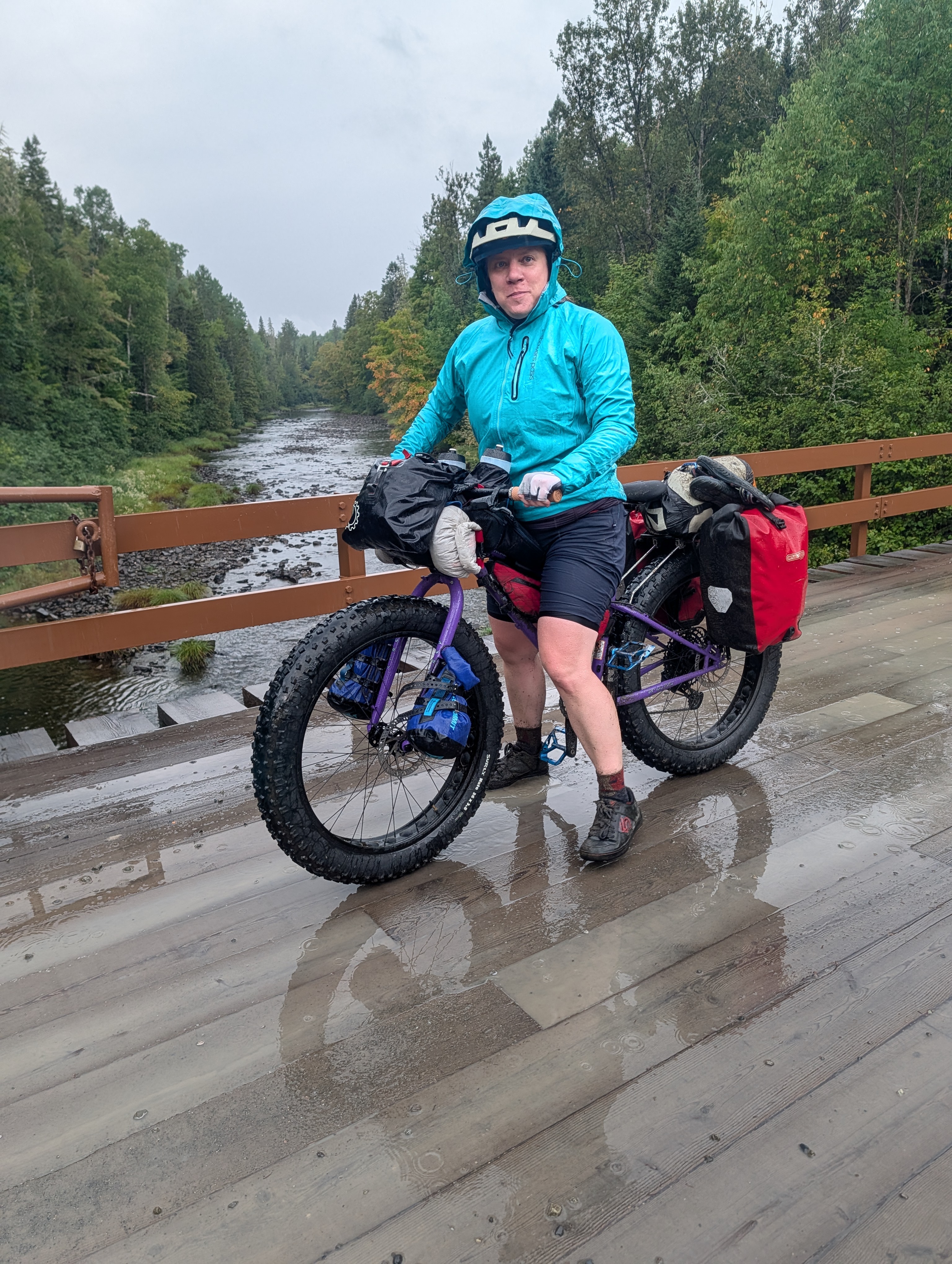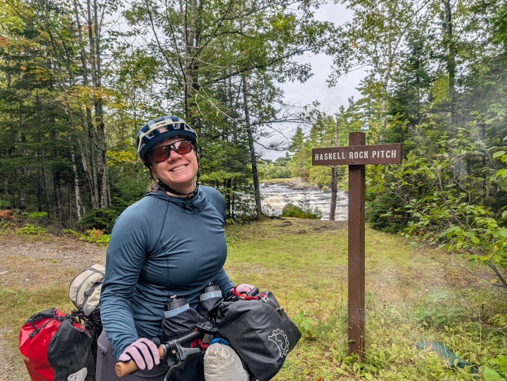 Thoroughly soaked through, we arrived at the Matagamon Gate and surrendered our pass to the Ranger, who was asking if we were on e-bikes. No e-bikes here – just analog human-powered transportation! A woman took our photo to send to her husband who is on the Great Divide Route right now.