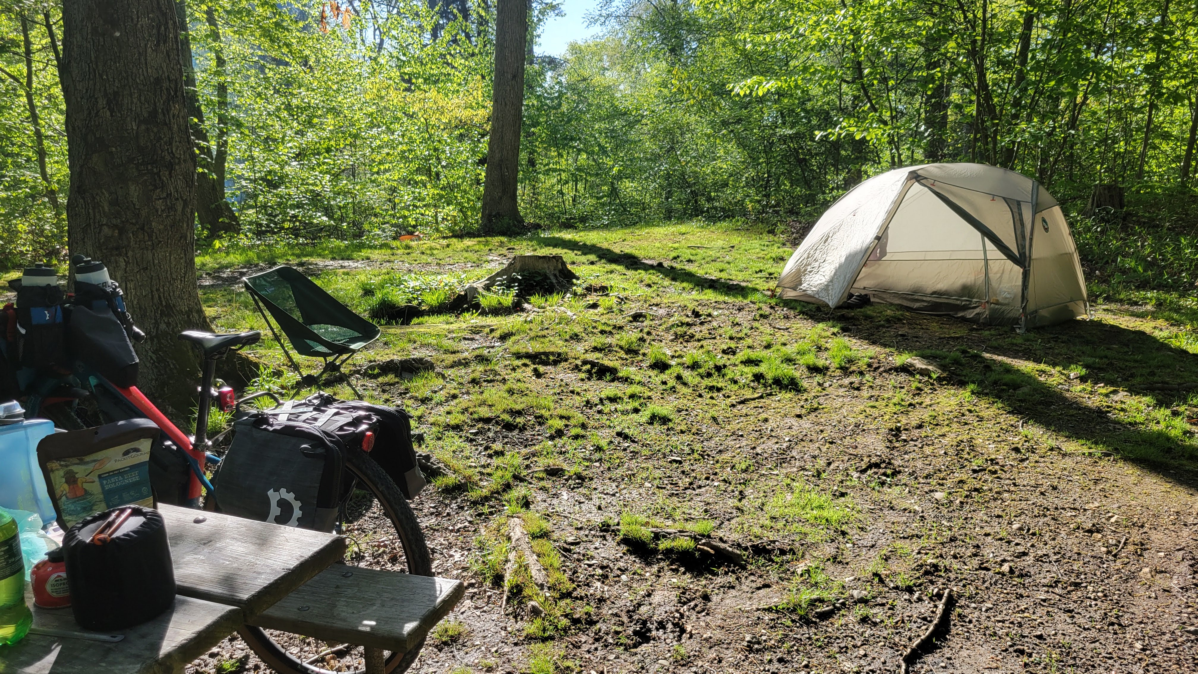 Once we get there though, we decide to just call it for the day. the Lunksoos Campground was beautiful, clean, and there was only one other camper – Mo The Gravel Cyclist. We chatted with Mo and he gave us some pro tips for the next day’s route to avoid some impassable roads. Mo is retired and spends his time out camping and riding his super-sick Cutthroat with Lauf fork. Mo asked us if we were on e-bikes.