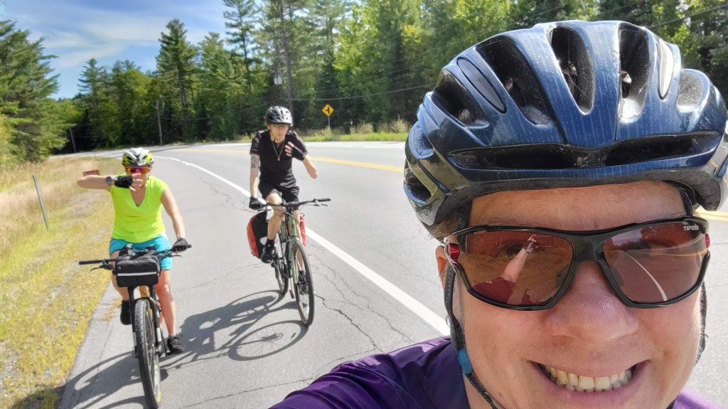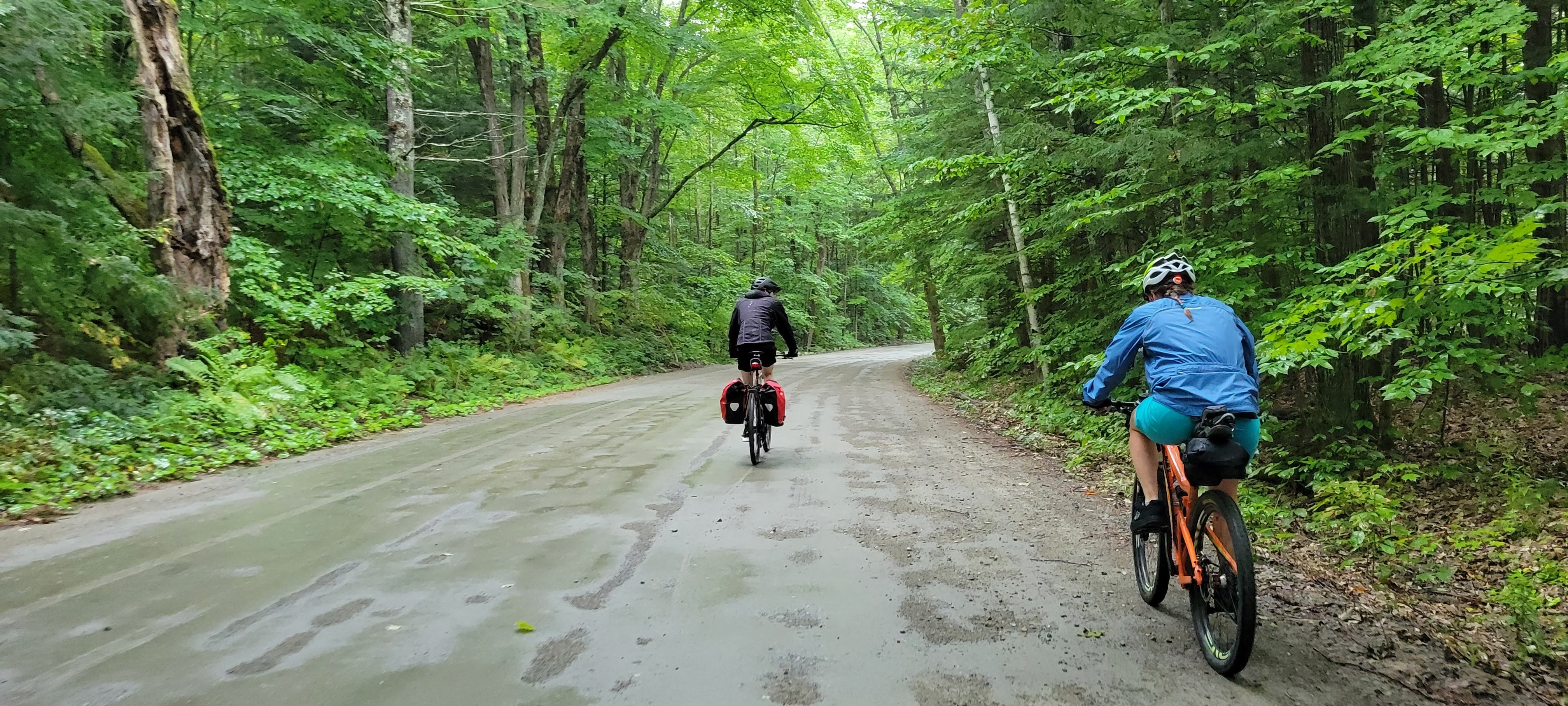 Thoroughly soaked through, we arrived at the Matagamon Gate and surrendered our pass to the Ranger, who was asking if we were on e-bikes. No e-bikes here – just analog human-powered transportation! A woman took our photo to send to her husband who is on the Great Divide Route right now.