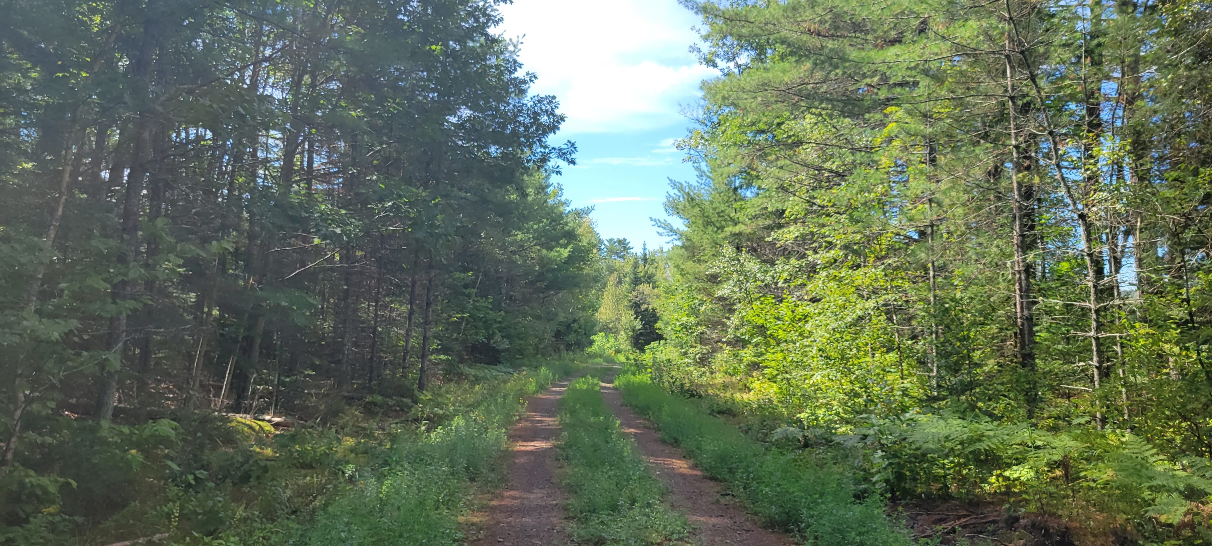 We head out on a wonderful snowmobile trail before turning onto logging roads. We stop for lunch on the side of the road with a beautiful view of Katahdin. The logging road starts to be more two-track and then devolves further into an overgrown mess of rocks, moss, and thick leaves.