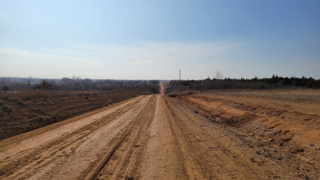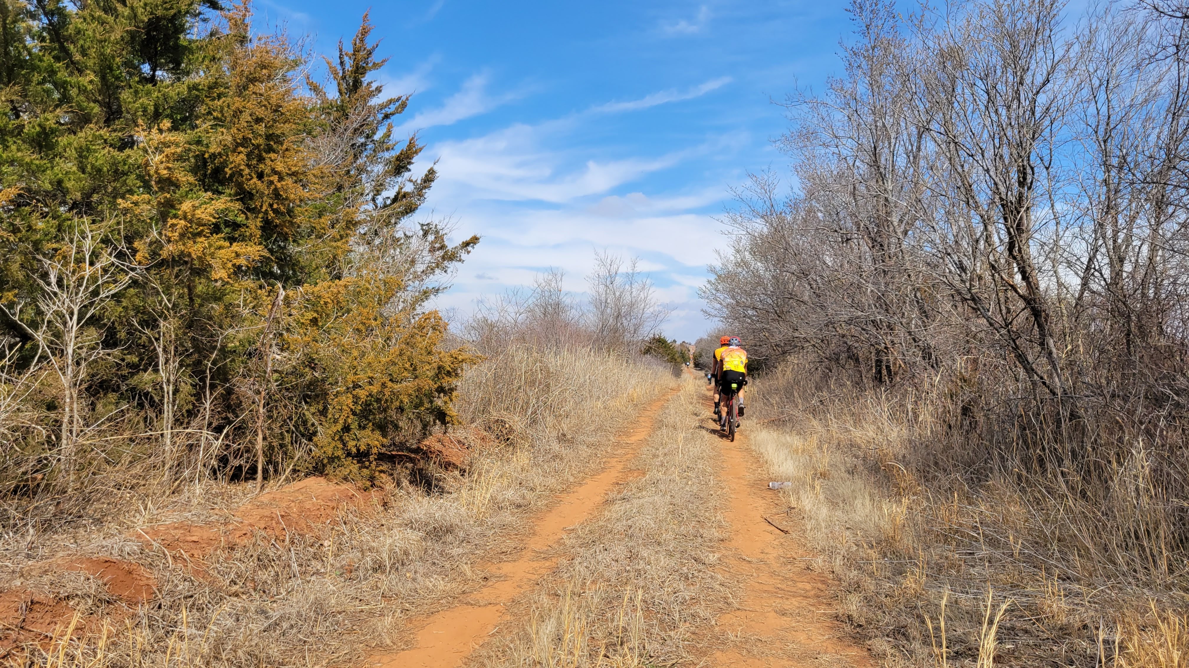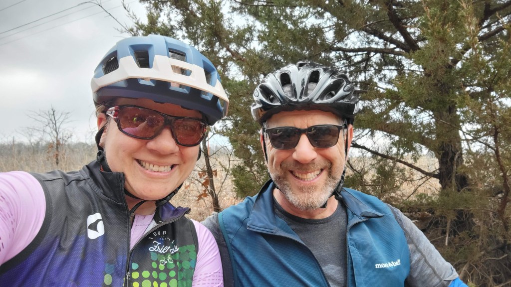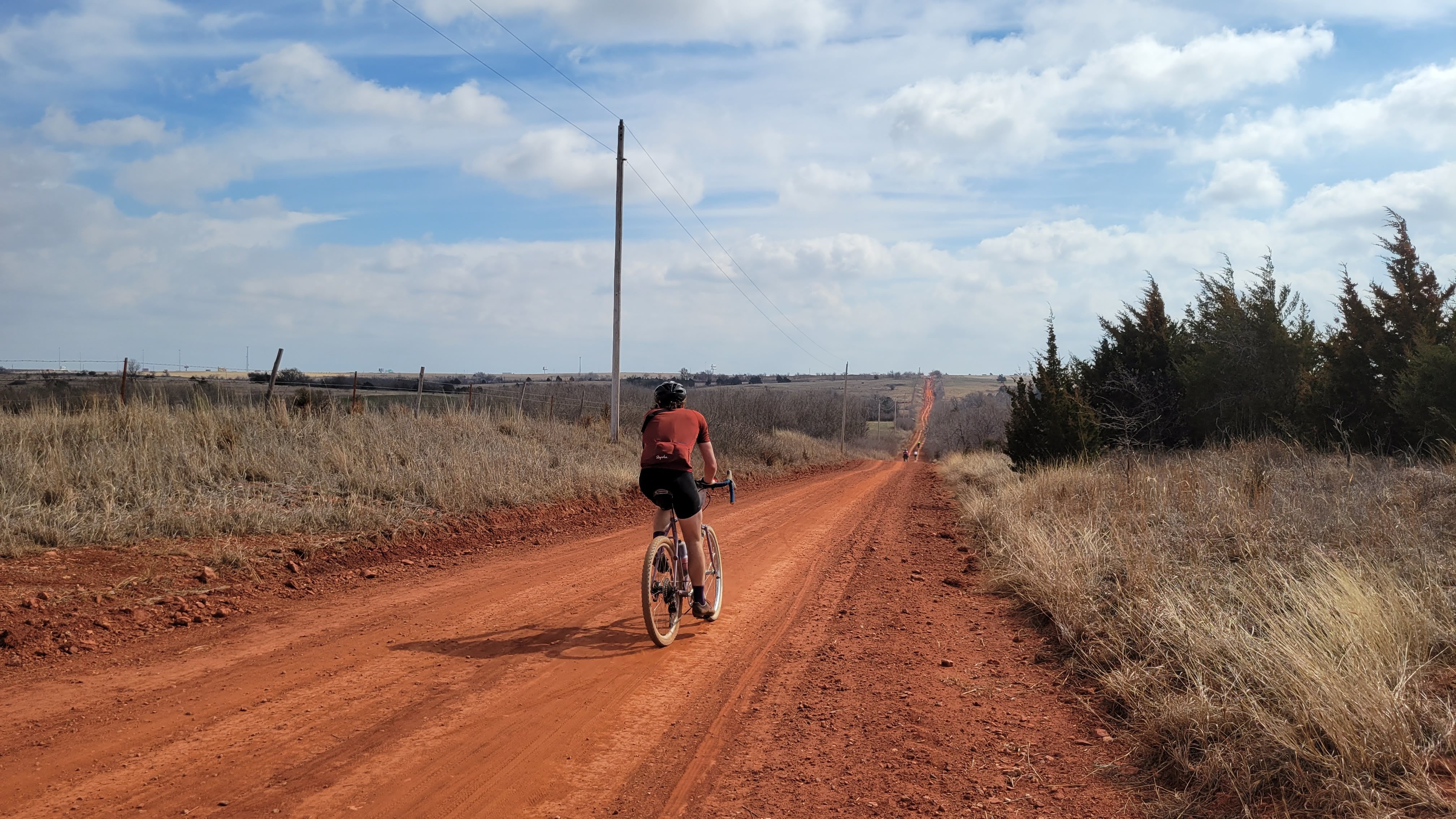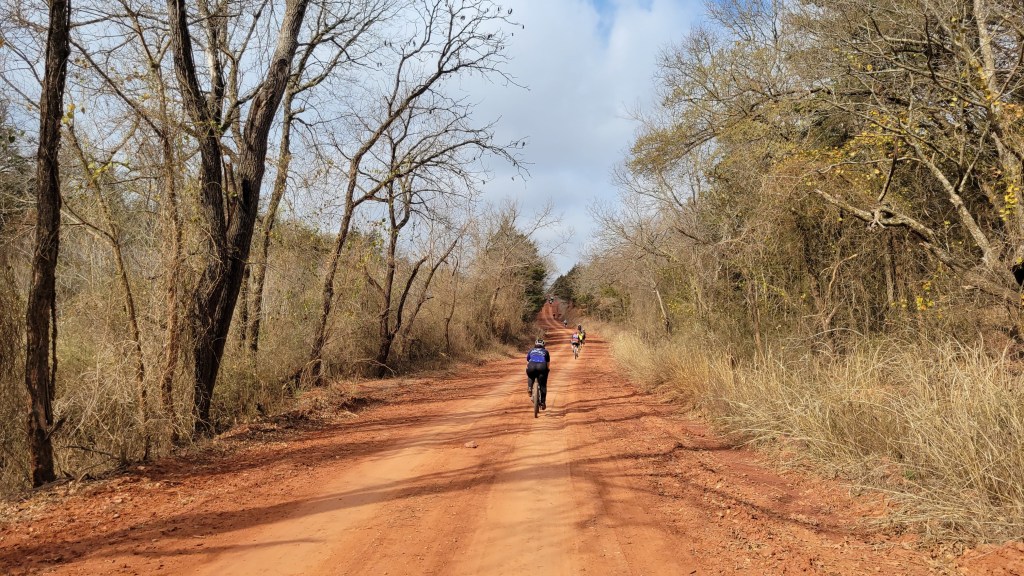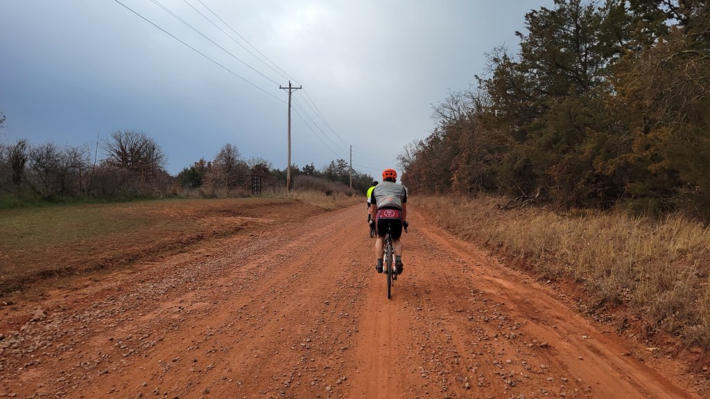 Starting the day under cloudy skies, mid-50*F temps; brilliant sun coming out around mile 20; Wind; relaxing in the shade in Perry at mile 50 with my sister, her partner, her kids, and my husband; double-track and rustic, rutted-out roads; Clouds returning after mile 68 and powerful wind gusts from the North; turning right onto a 7-mile flat stretch and motoring along as the wind shifted from the West and provided a nice tailwind; another rustic road; riding through Oklahoma State University campus as we rolled back into Stillwater; hammering it the last few miles to the finish