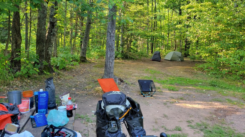 Once we get there though, we decide to just call it for the day. the Lunksoos Campground was beautiful, clean, and there was only one other camper – Mo The Gravel Cyclist. We chatted with Mo and he gave us some pro tips for the next day’s route to avoid some impassable roads. Mo is retired and spends his time out camping and riding his super-sick Cutthroat with Lauf fork. Mo asked us if we were on e-bikes.